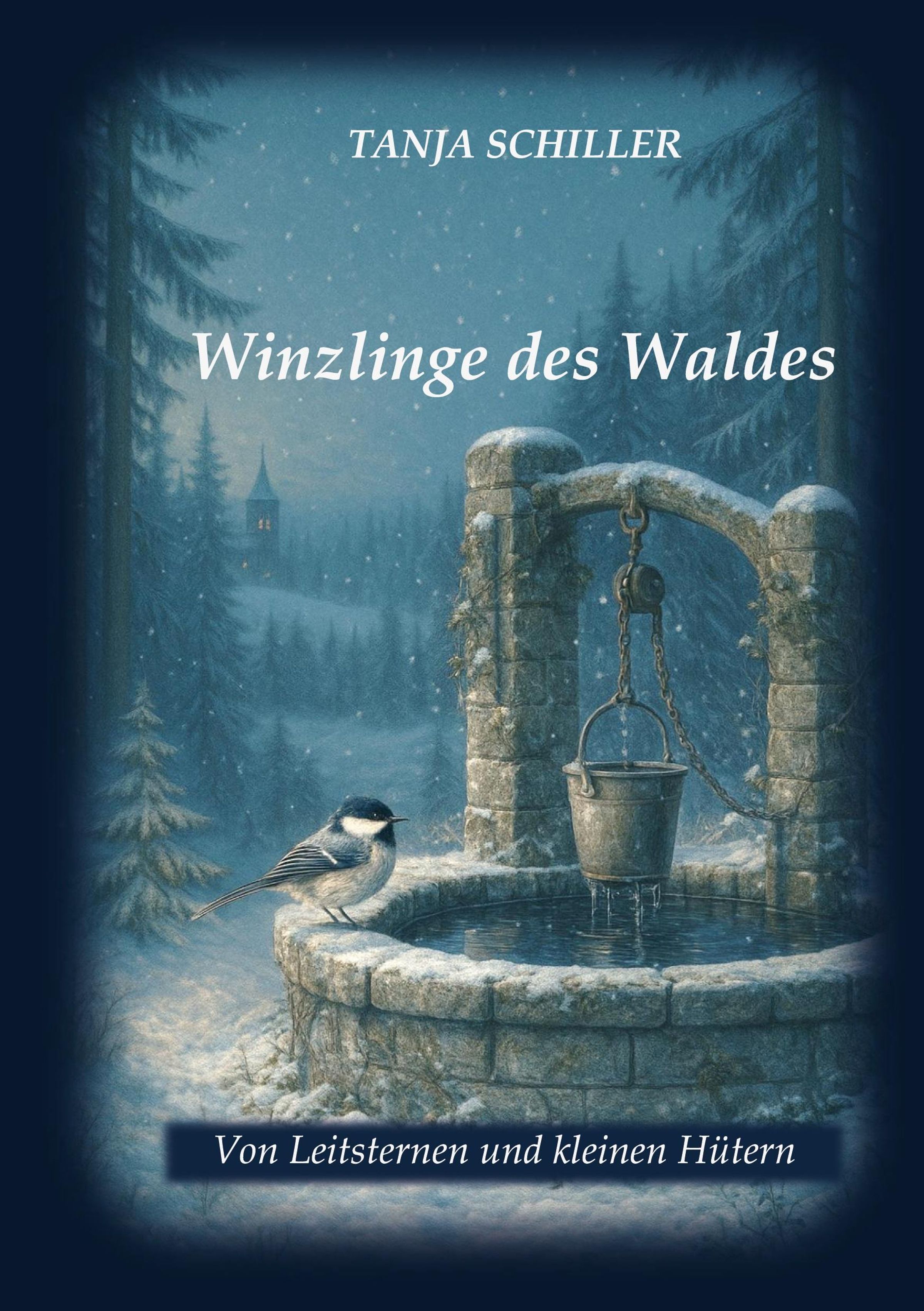 "Winzlinge des Waldes" von Tanja Schiller. Illustration: Winterwald mit Brunnen, darauf ein Vogel sitzend., Buch
