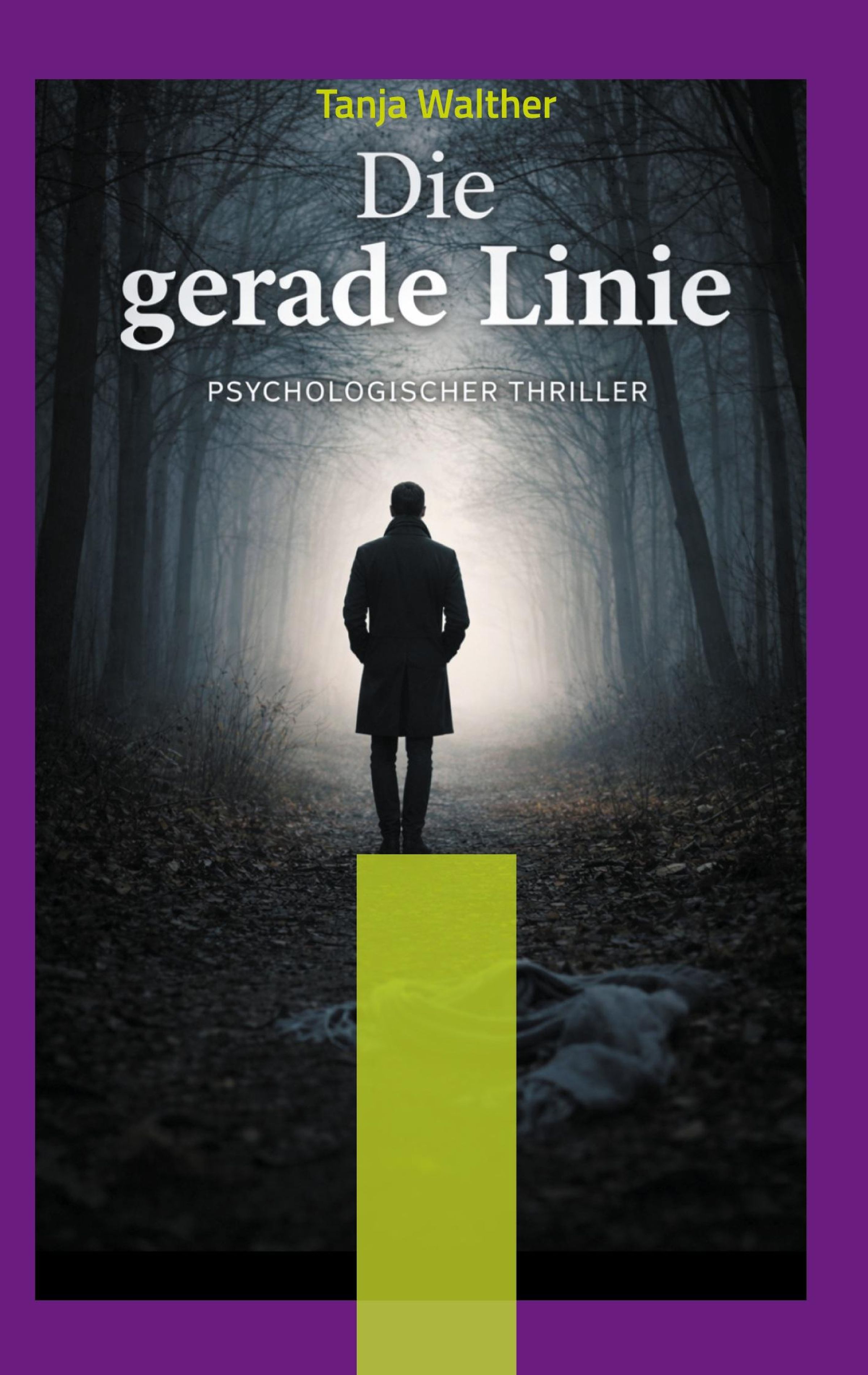 „Die gerade Linie“ – Psychologischer Thriller. Illustration: Einsamer Mann in dunklem Mantel in einem nebligen Waldweg., Buch