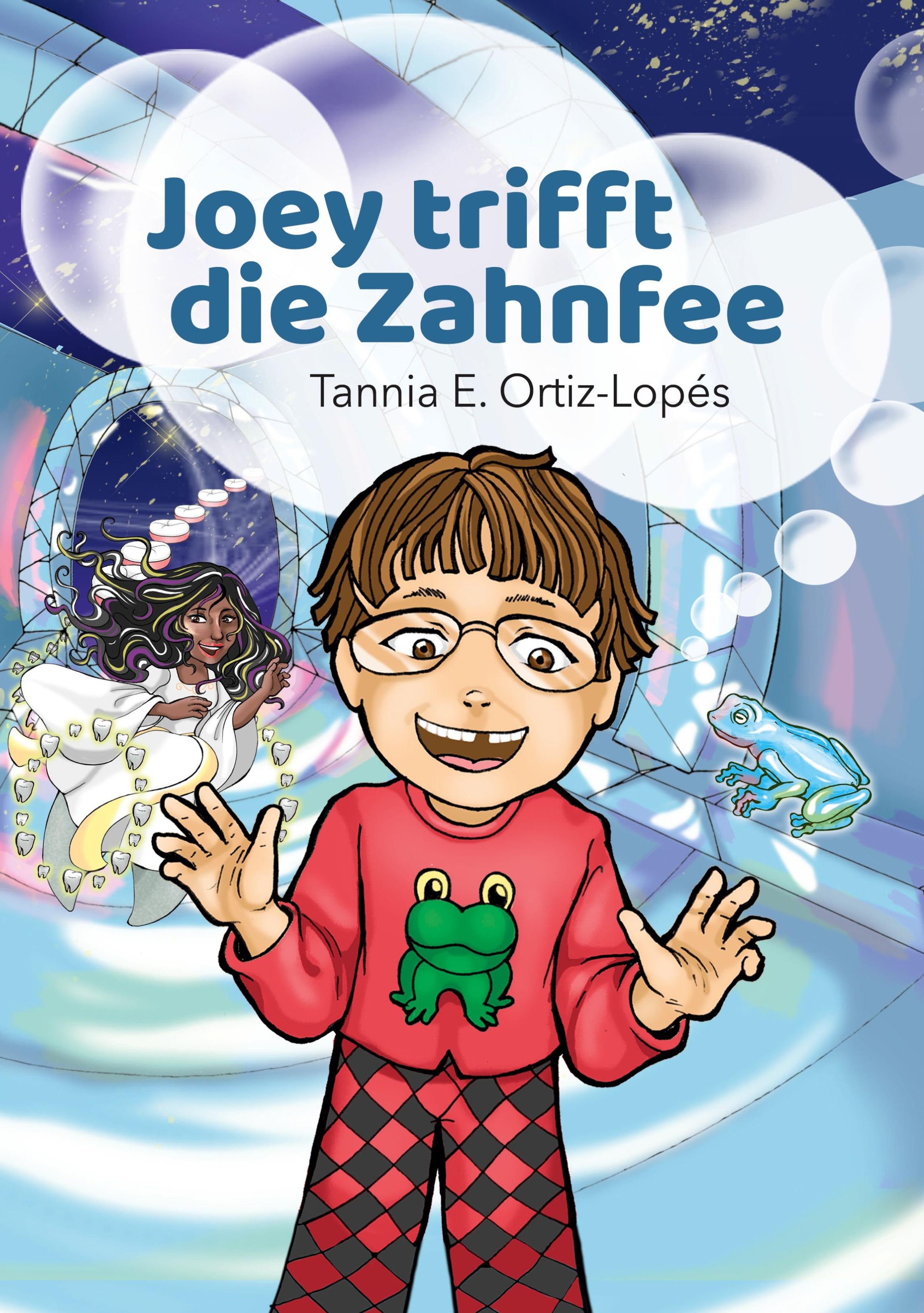 „Joey trifft die Zahnfee“ von Tannia E. Ortiz-Lopés. Ein lachender Junge in rotem Pulli mit Frosch und bunter Umgebung., Buch