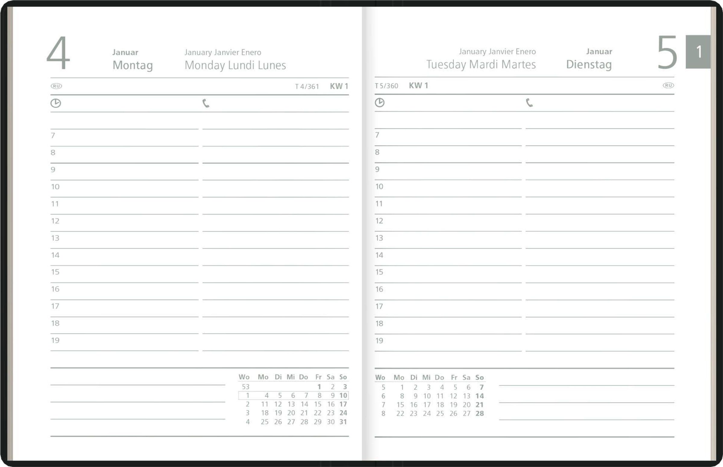 Format & Ausstattung: 10 × 14 cm, 400 Seiten, robuster schwarzer Kunststoffeinband mit silberner Jahreszahl