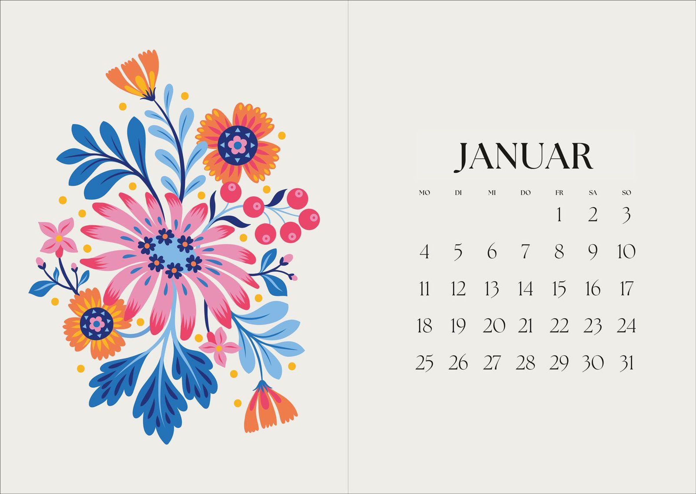 2027, florales Muster mit bunten Blüten und Blättern auf rosa Hintergrund, Stickerei-ähnlicher Stil., Buch