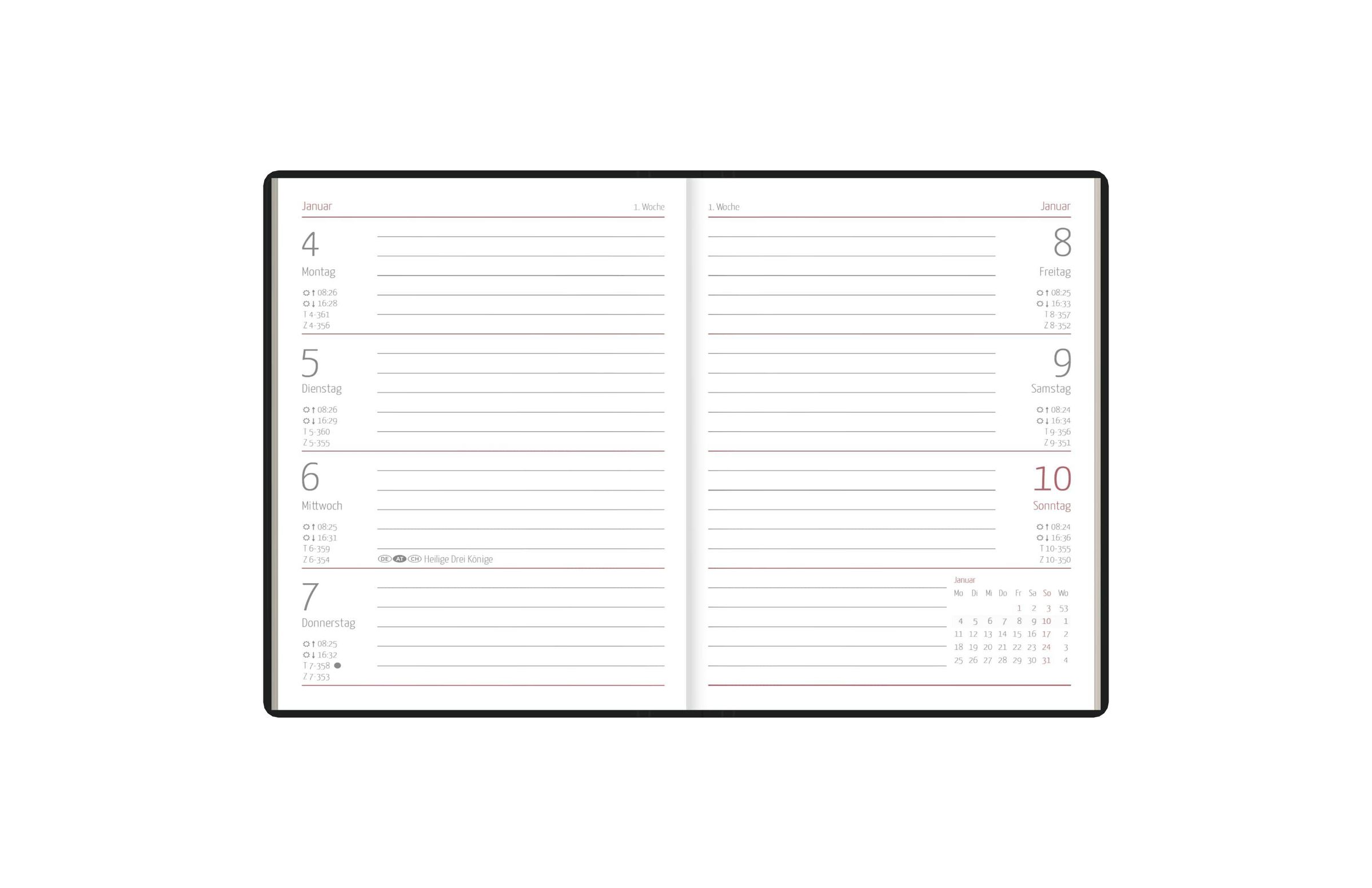 Übersichtliches Kalendarium: 1 Woche auf 2 Seiten, mit hervorgehobenen Sonn- und Feiertagen, Arbeitstage-, Tages- und Wochenzählung