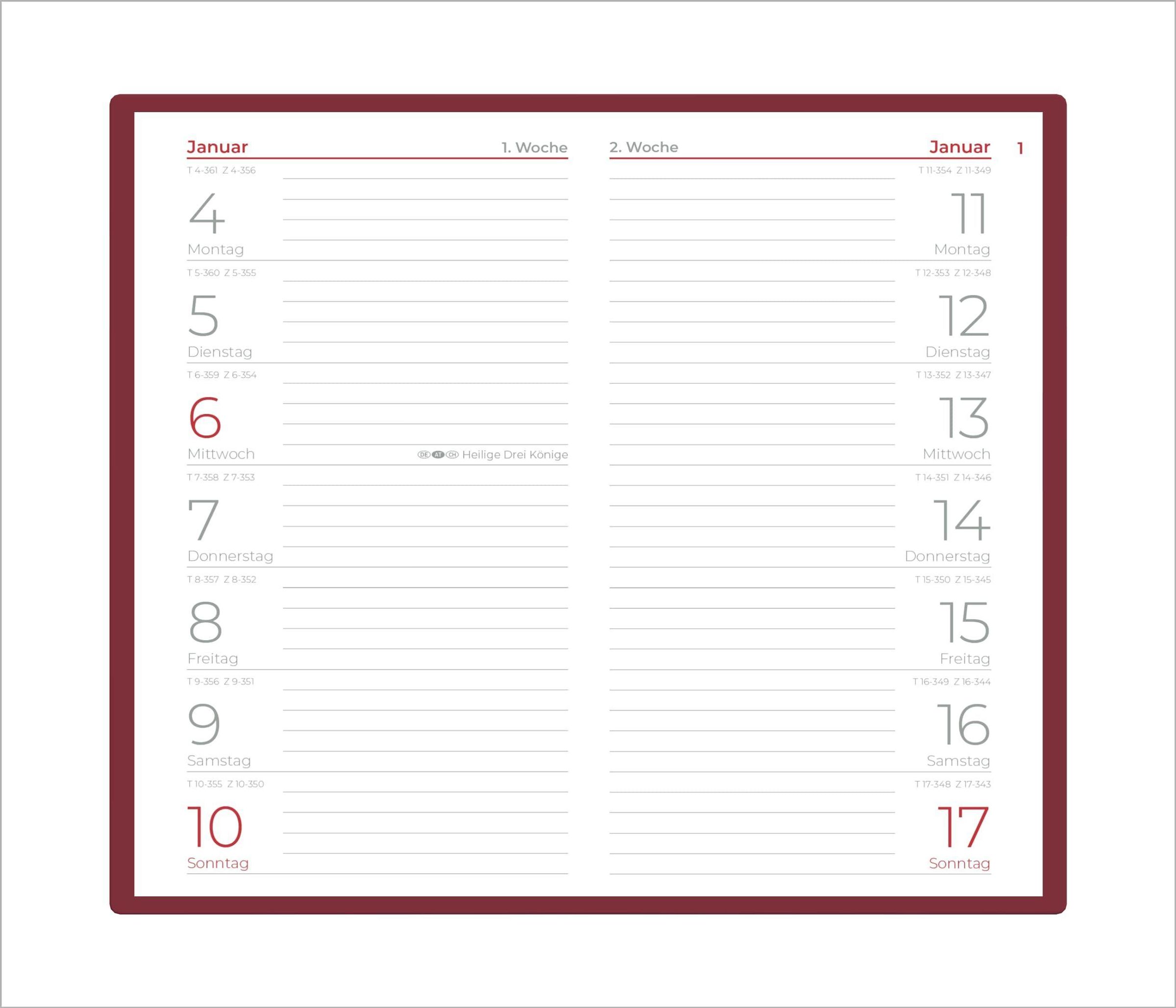 Kalendarium: 1 Woche auf 1 Seite, 64 Seiten, Sonn- und Feiertage hervorgehoben