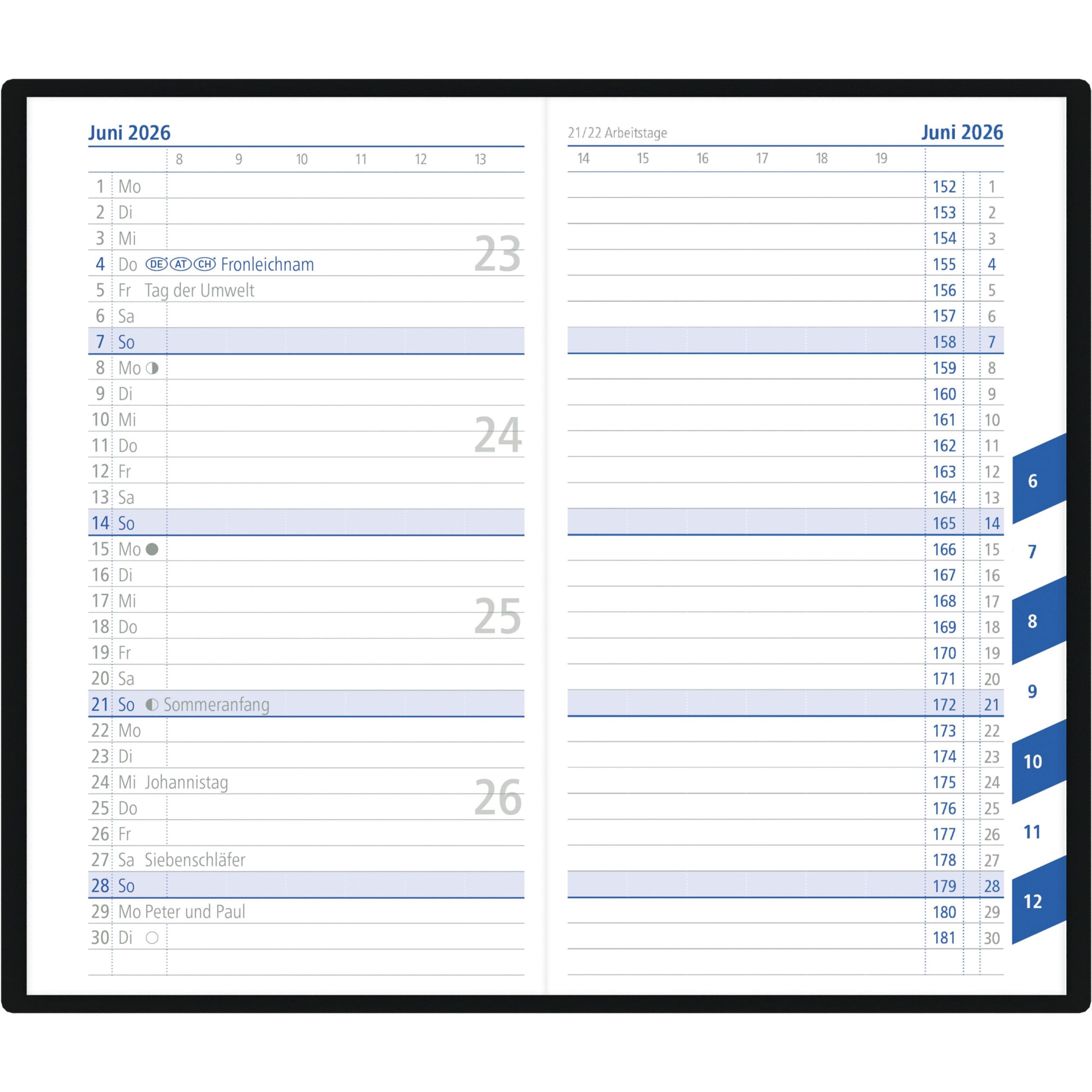 Praktische Details: 32 Seiten, geheftet, eingesteckt in Kunststoffhülle, mit Registerschnitt, Kalendarium nachfüllbar und austauschbar