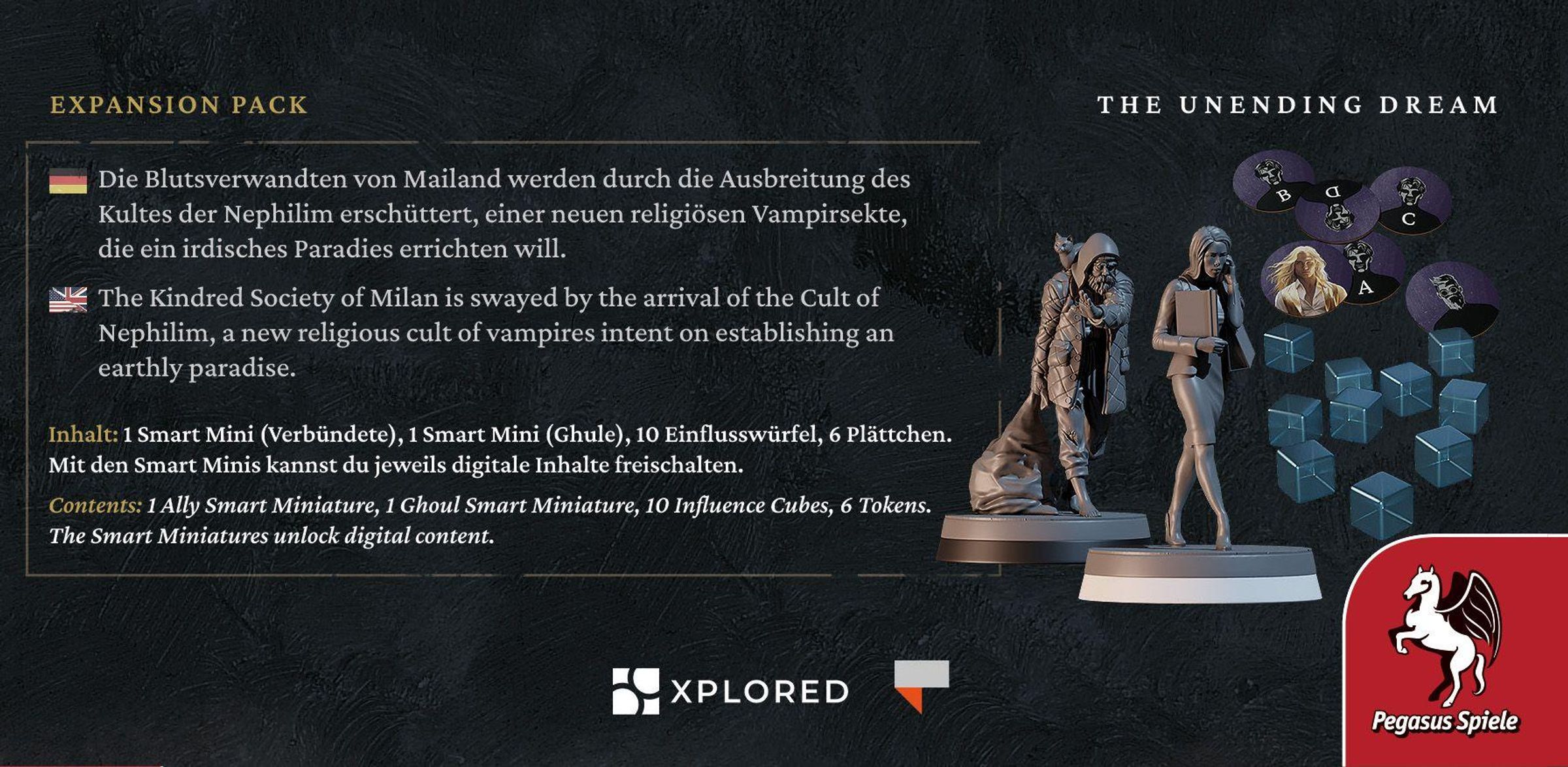 Die Blutsverwandten von Mailand werden durch die Ausbreitung des Kultes der Nephilim erschüttert, einer neuen religiösen Vampirsekte, die ein irdisches Paradies errichten will. Mit dieser Story-Erweiterung werden 10+ Stunden an neuen, digitalen Inhalten im Grundspiel Vampire: The Masquerade - Milan Uprising freigeschaltet, die die Spielenden noch tiefer in die Geschichte eintauchen lassen. Dies ist eine Erweiterung, kein Grundspiel. Zum Spielen werden zusätzlich das Teburu Board sowie das Grundspiel Vampire: The Masquerade - Milan Uprising benötigt. Außerdem ist eine kostenlose digitale App erforderlich (deutsche Version verfügbar).