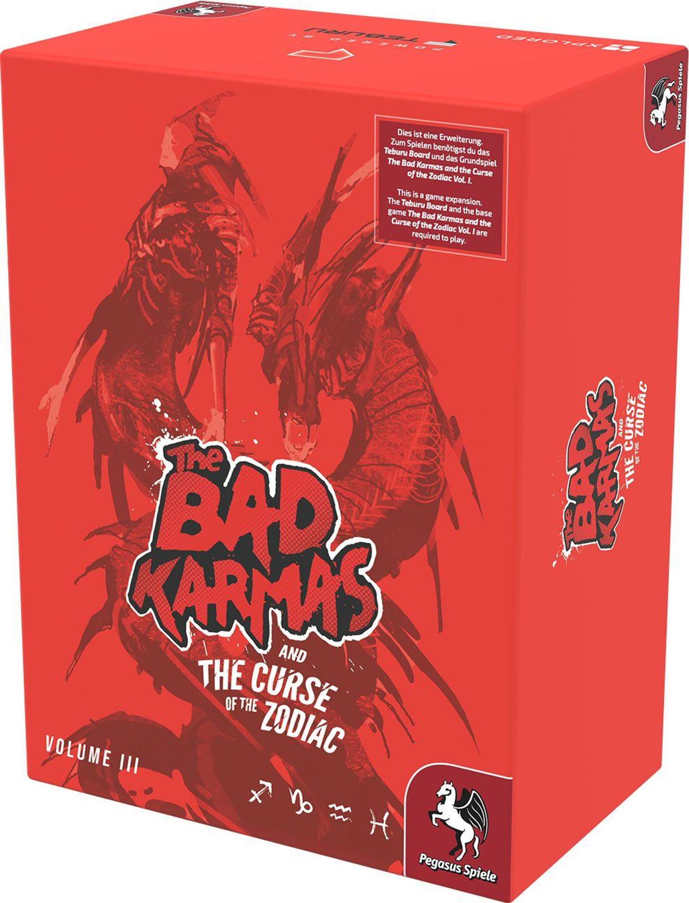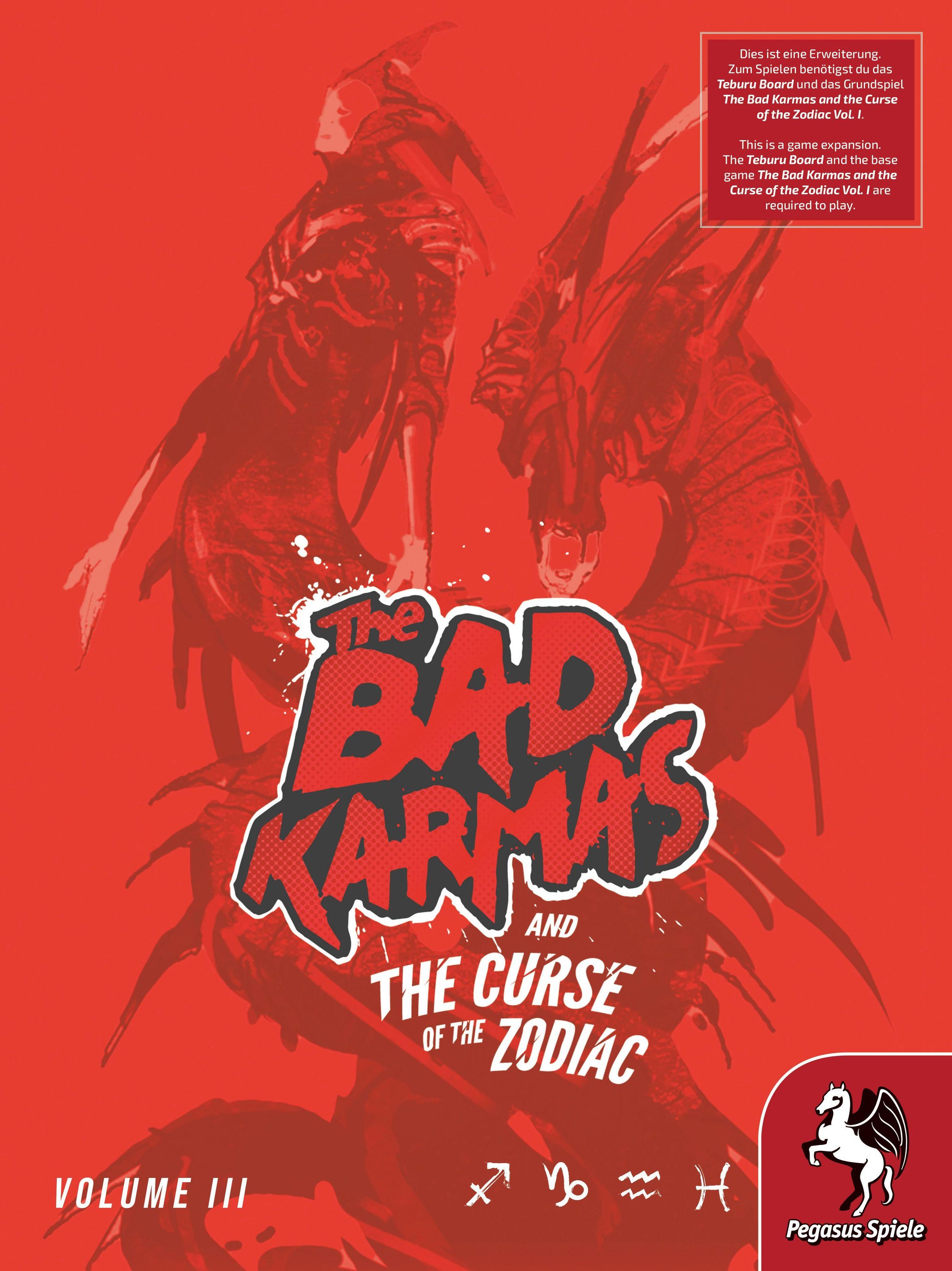 Das finale Kapitel im Kampf der Bad Karmas um das Überleben der Menschheit! In dieser Erweiterung von The Bad Karmas and the Curse of the Zodiac treten die Spielenden gegen die letzten 4 Zodiacs an: Saggitarius, Capricorn, Aquarius und Pisces. Volume 3 fügt der The Bad Karmas-Saga vier neue Bosse hinzu. Um diese Erweiterung zu Spielen ist das Grundspiel (Volume 1) erforderlich. Dies ist eine Erweiterung. Zum Spielen werden das Teburu Board und das Grundspiel The Bad Karmas and the Curse of the Zodiac Vol. 1 benötigt. Zum Spielen von TBK ist eine kostenlose digitale App erforderlich (deutsche Version verfügbar).