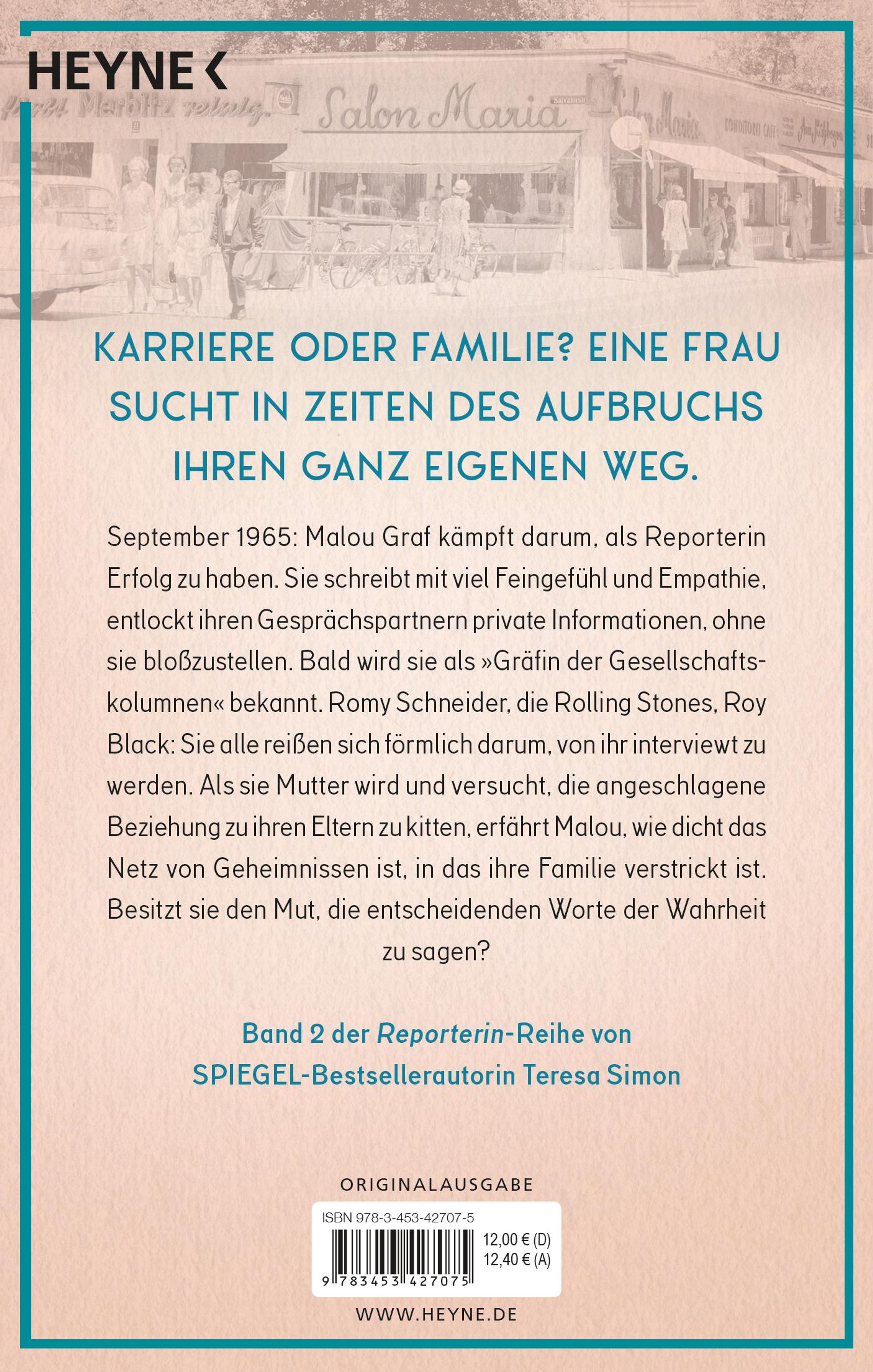 September 1965: Malou Graf kämpft darum, in ihrem Beruf als Reporterin weiter Erfolg zu haben. Sie schreibt mit viel Feingefühl und Empathie, entlockt ihren Gesprächspartnern private Informationen, ohne sie bloßzustellen. Bald wird sie als >>Gräfin der Gesellschaftskolumnen<< bekannt. Romy Schneider, die Rolling Stones, Roy Black: Sie alle reißen sich förmlich darum, von ihr interviewt zu werden. Als sie Mutter wird und versucht, die angeschlagene Beziehung zu ihren Eltern zu kitten, erfährt Malou auf schmerzhafte Weise, wie schwierig es als Frau ist, Karriere und privates Glück zu vereinen. Muss sie eine Entscheidung fällen? Kann sie das überhaupt?