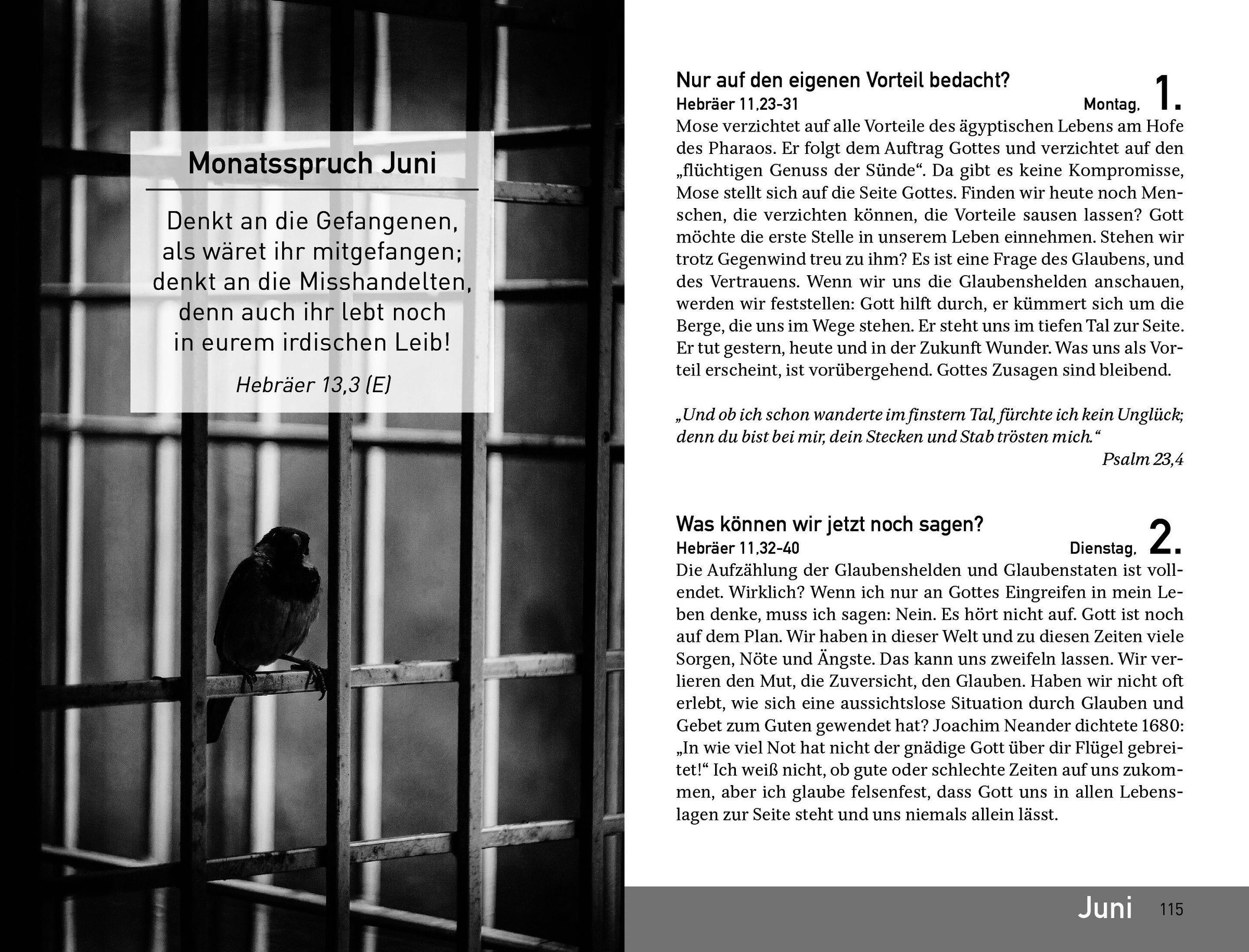 Mehr als 50 aktive Mitarbeiter aus dem CVJM und aus unterschiedlichen Kirchen und christlichen Werken machen die Termine zum unentbehrlichen Begleiter für die tägliche Zeit mit Gott. Die Auslegungen bringen den Text auf den Punkt und geben einen Impuls für den Alltag mit.