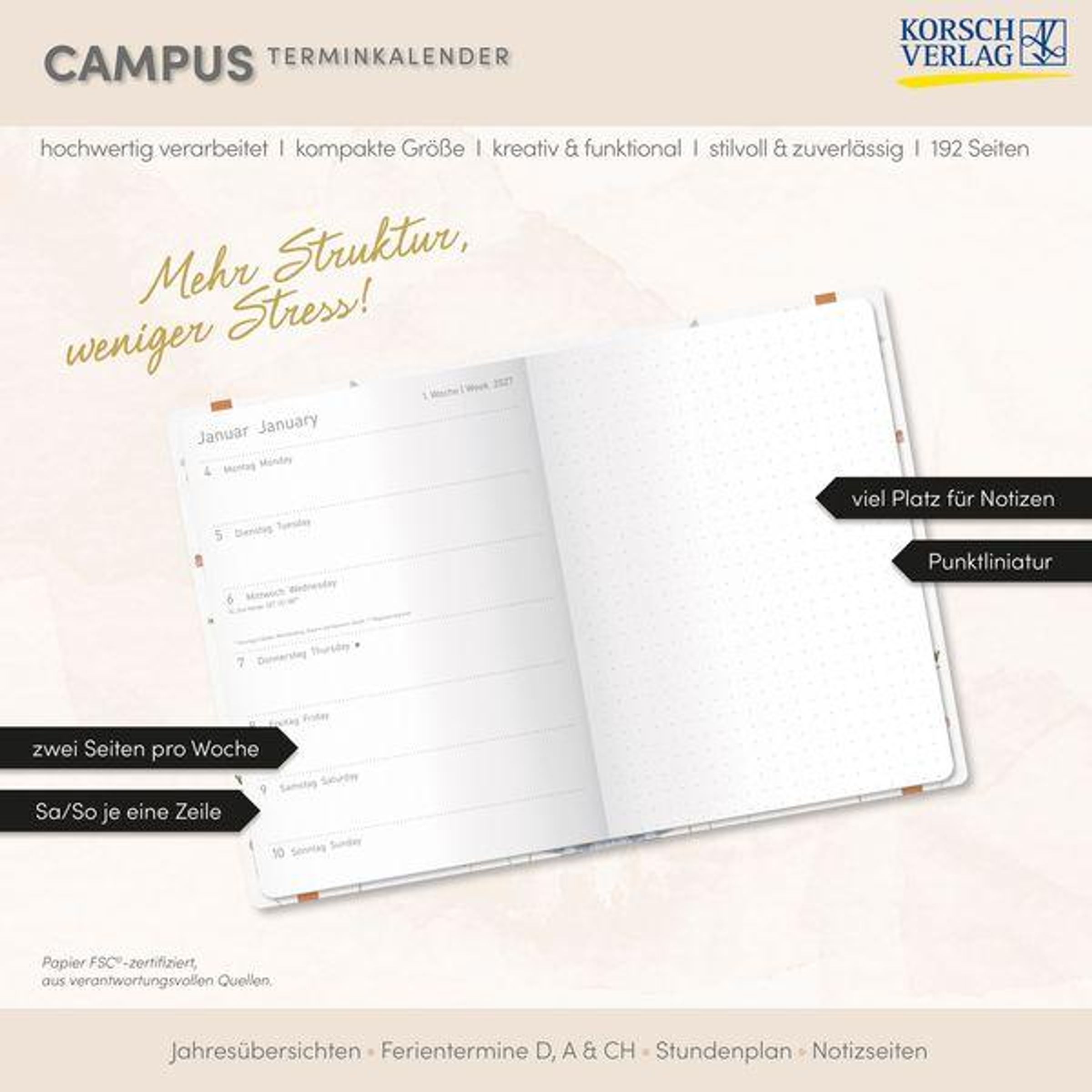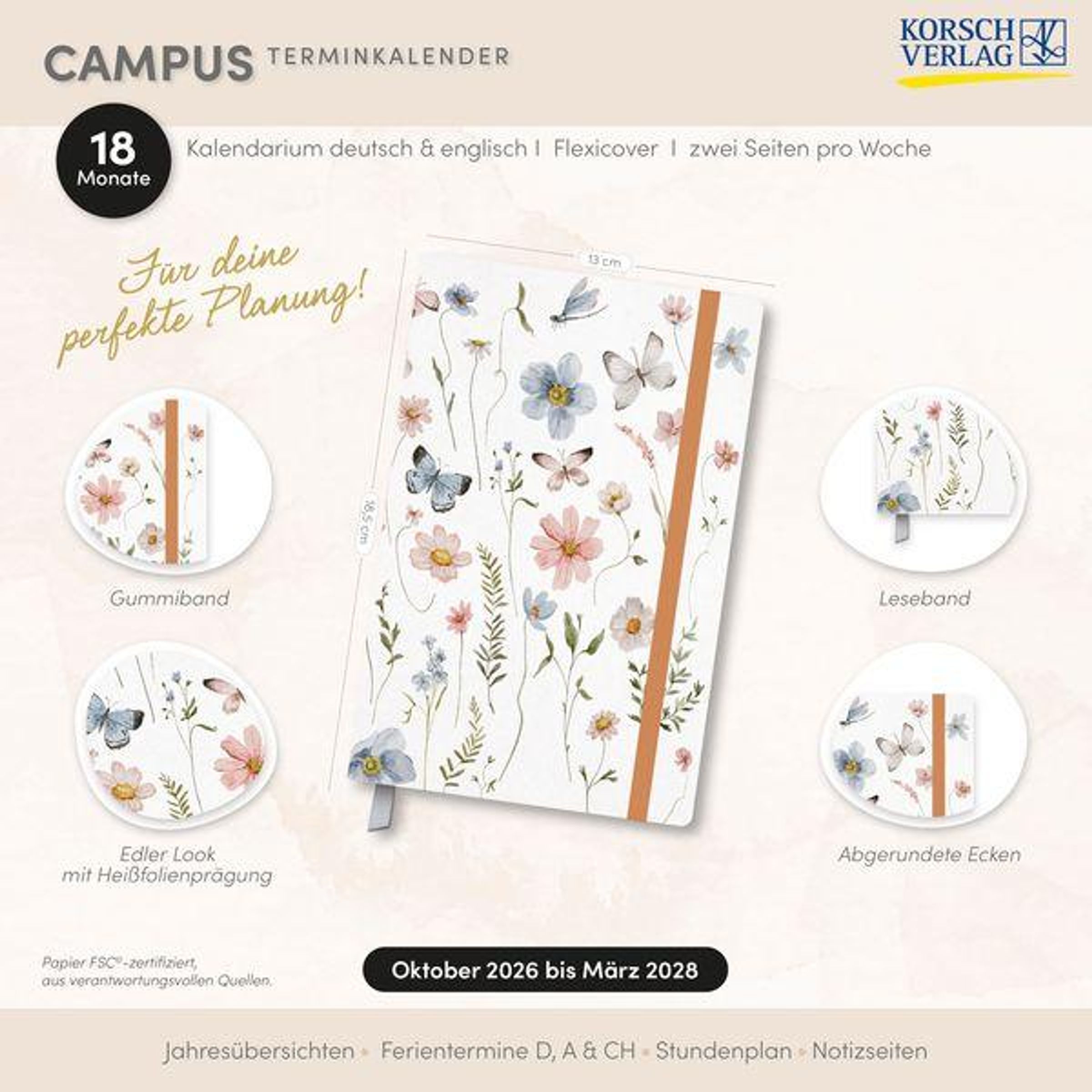 - Terminplaner 13 x 18,5 cm. Kalendarium von Oktober 2026 bis März 2028. Platz für Notizen und Lesezeichenband.