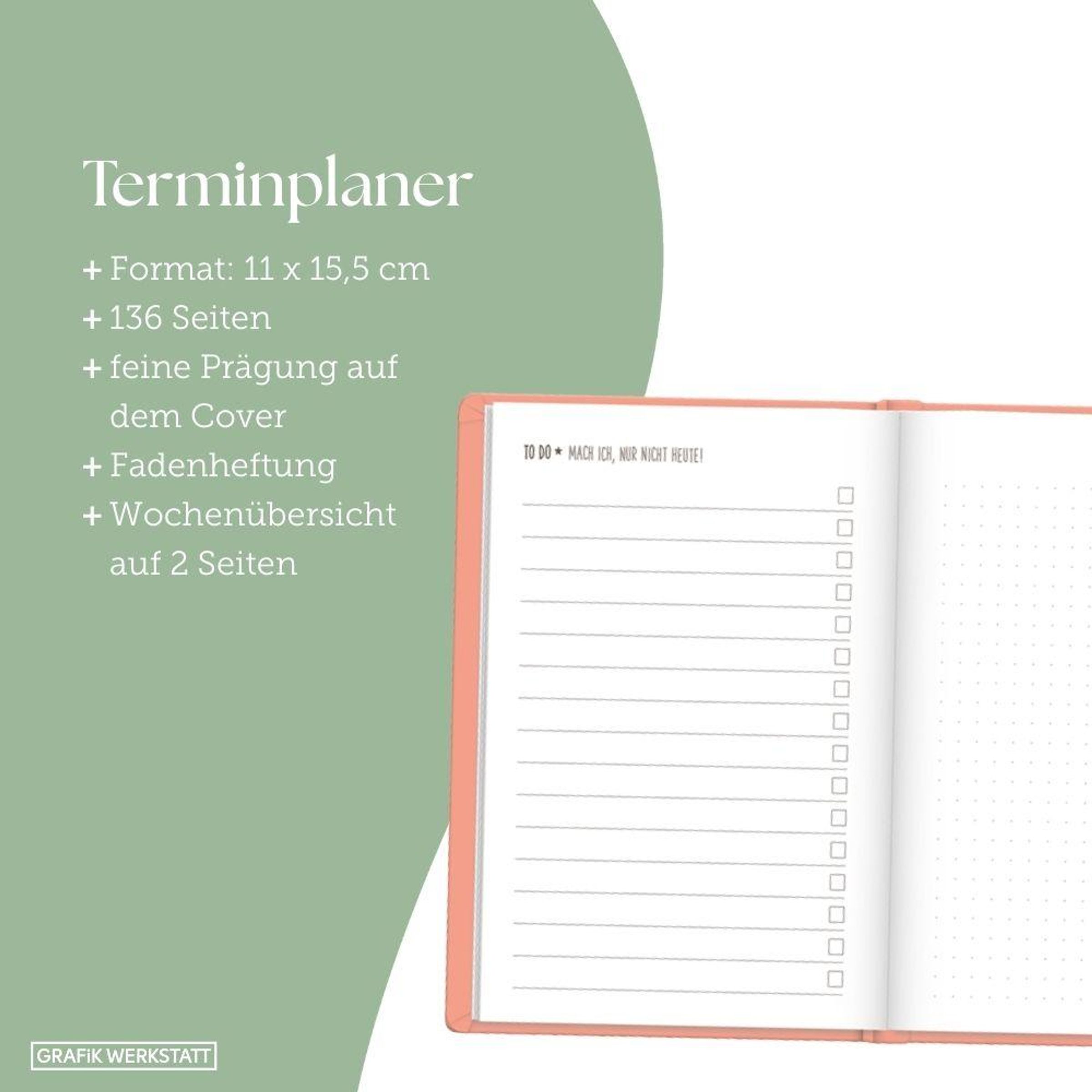 Mit diesem kleinen Terminplaner kannst du das Jahr 2027 strukturiert und einfach planen. Dank der Wochenübersicht auf einer Doppelseite, viel Platz für Notizen und einem Satin-Lesezeichen verlierst du niemals den Überblick. Eine Jahres- & Monatsvorschau auf einer Seite bietet dir die Möglichkeit das Jahr 2027 optimal zu planen.