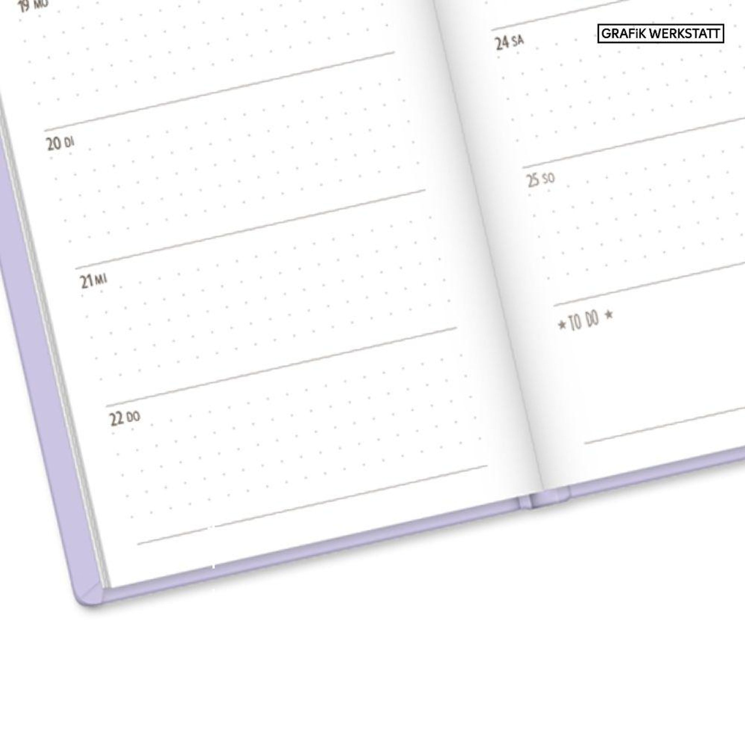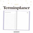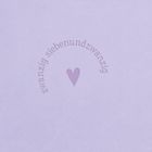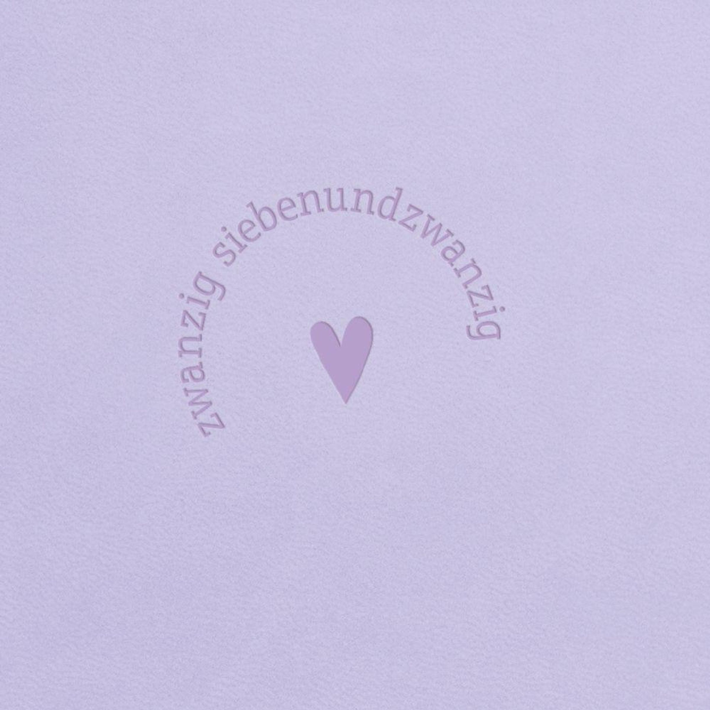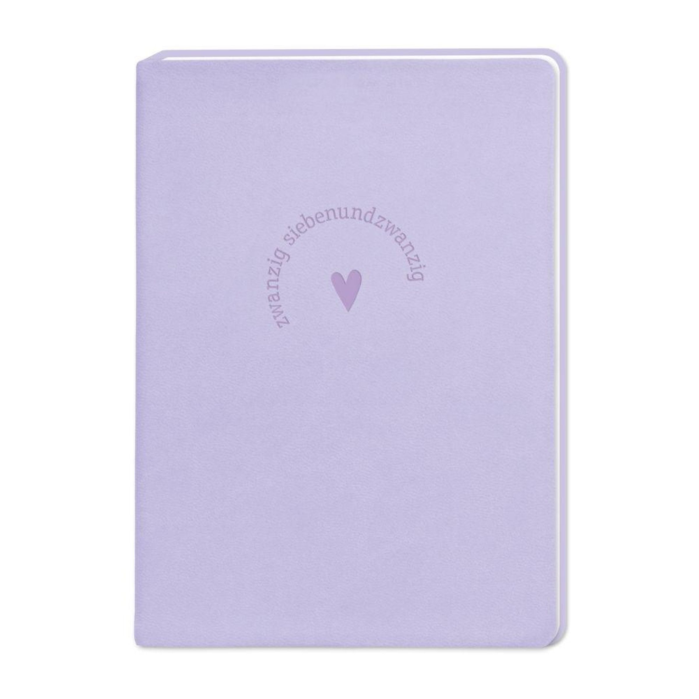 Der Text "zwanzig siebenundzwanzig" kreisförmig um ein Herz auf einem fliederfarbenen Notizbuch., Buch