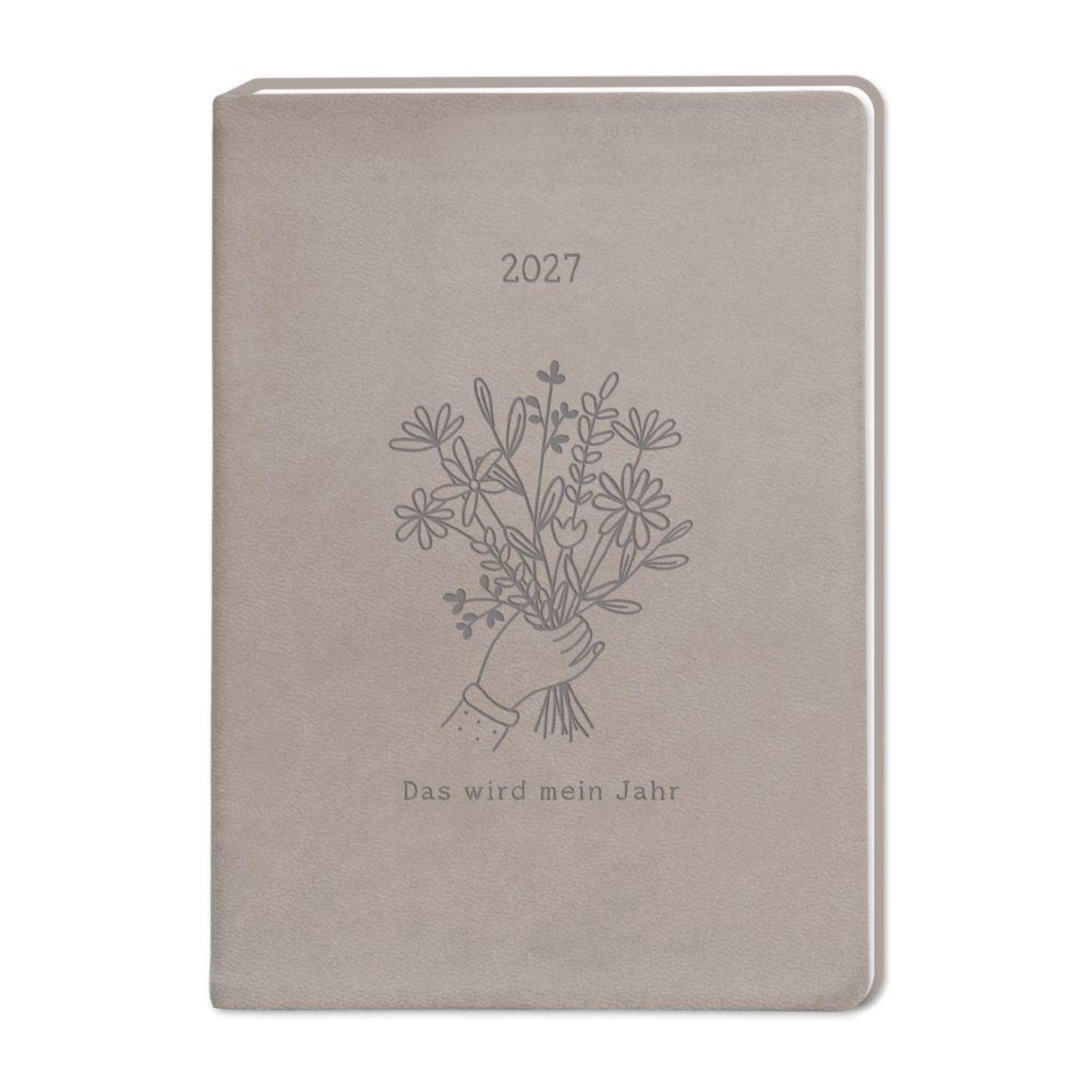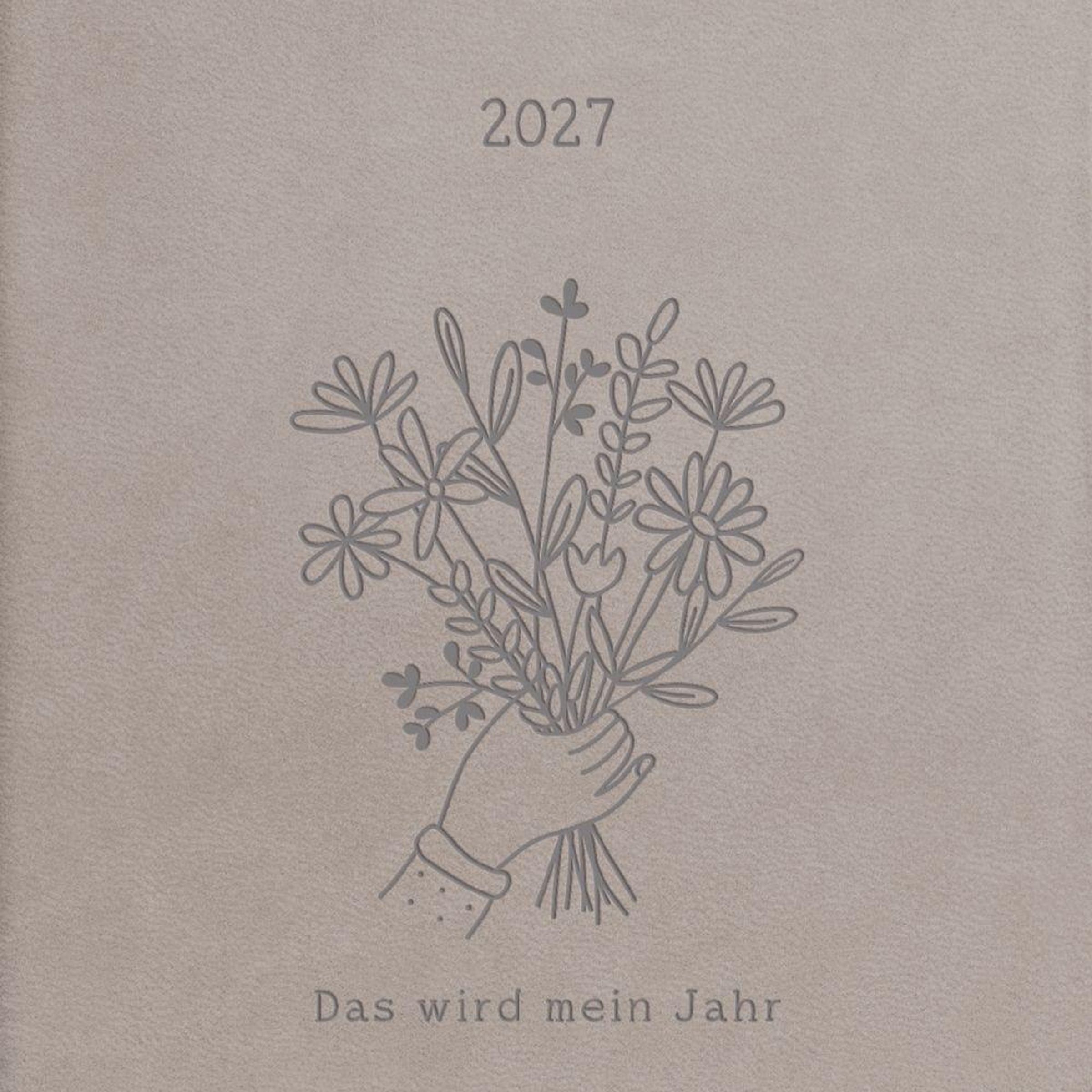 Text: "2027" und "Das wird mein Jahr". Illustration einer Hand, die einen Blumenstrauß hält. Beige Hintergrund., Buch