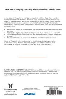 How does a company constantly win more business than its rivals? A key factor is the ability to create proposals that outshine those from even the strongest competitors. Powerful Proposals helps businesses maximize the selling power of their proposals, with proven strategies for going beyond "this is what we do" documents in favor of customer-centered offers that highlight the tangible benefits your company offers. This helpful resource offers tools and techniques that will let any firm: assess their ""winner or loser"" proposal status and take proactive steps to become a winner address the ""Big Four"" questions that a proposal must answer to be successful create ""A+"" proposals in less time with less wasted effort via a simple, repeatable process neutralize the issue of price when the firm is not the low-price provider