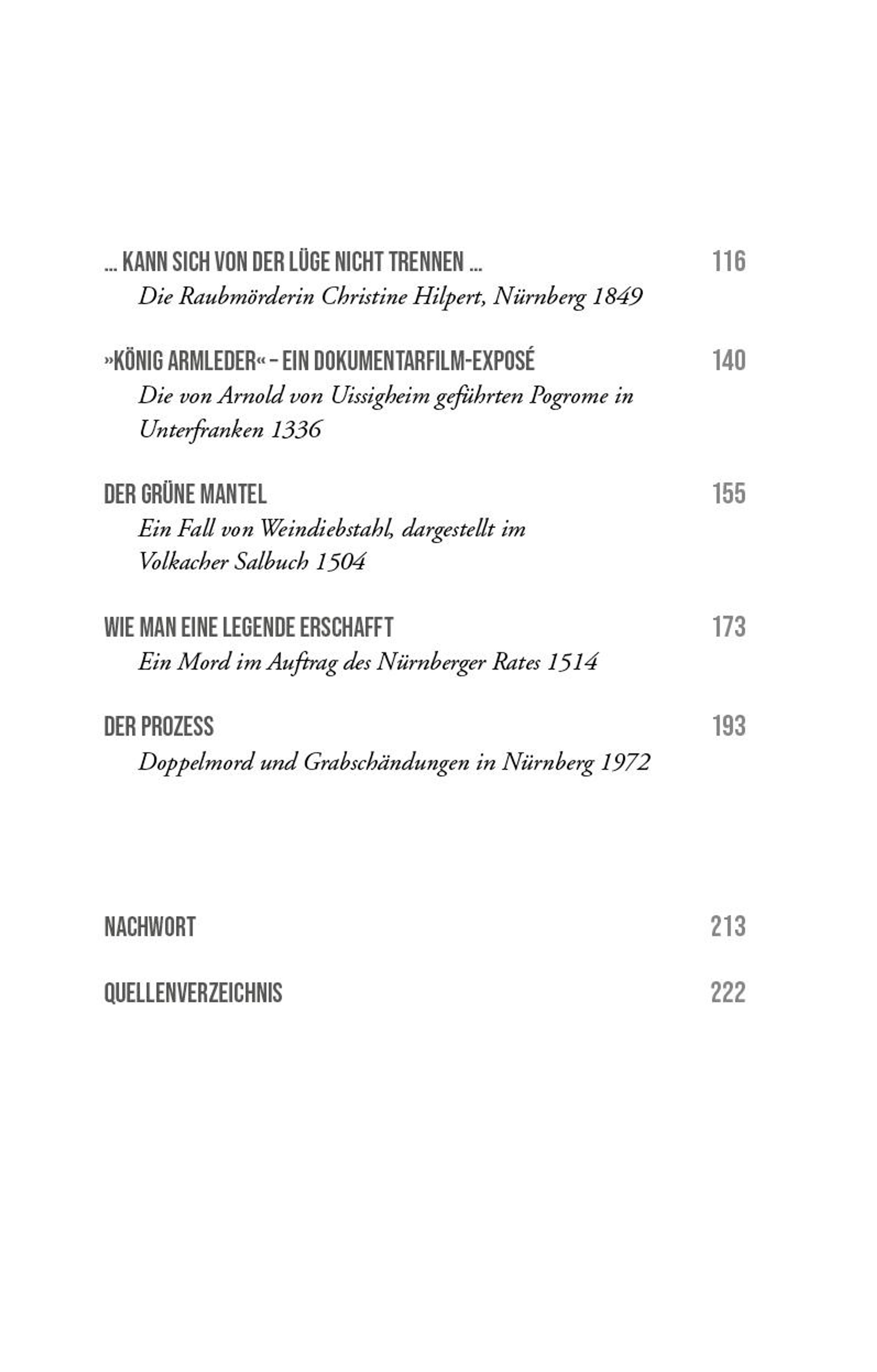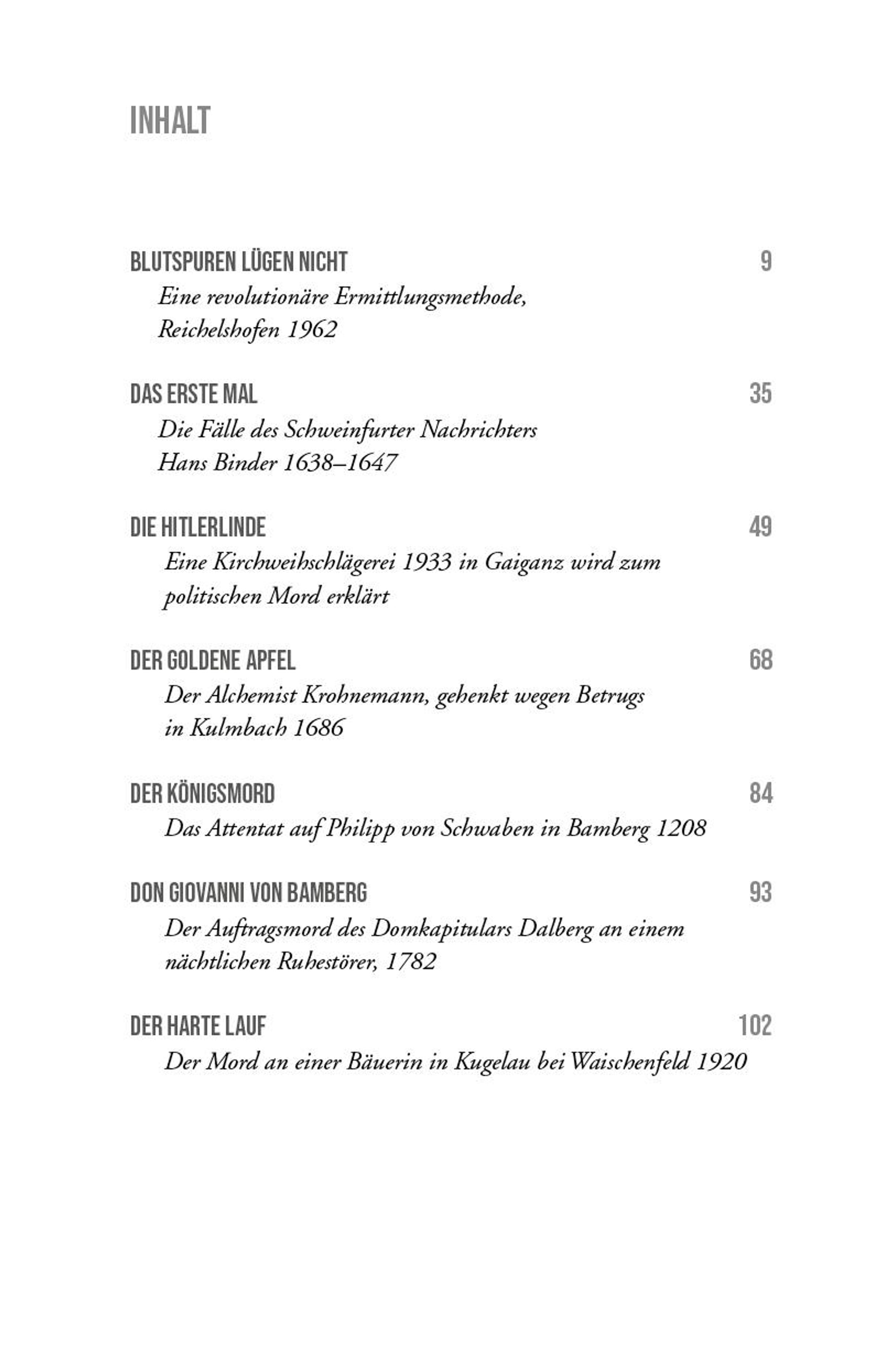 True Crime Franken beleuchtet zwölf wahre Mordfälle der fränkischen Kriminalgeschichte vom Spätmittelalter bis ins zwanzigste Jahrhundert auf fesselnde und anschauliche Weise. Tessa Korber und Elmar Tannert sind den Spuren des Verbrechens literarisch gefolgt und machen das Lokal- und Zeitkolorit eines jeden Falles lebendig. Ihre Texte handeln von Henkern und Raubrittern, von dichtenden Mördern, geheimnisvollen Briefen, Familiendramen und politischen Instrumentalisierungen. Und immer wieder zeigt sich: Die Wirklichkeit ist die beste Erzählerin.