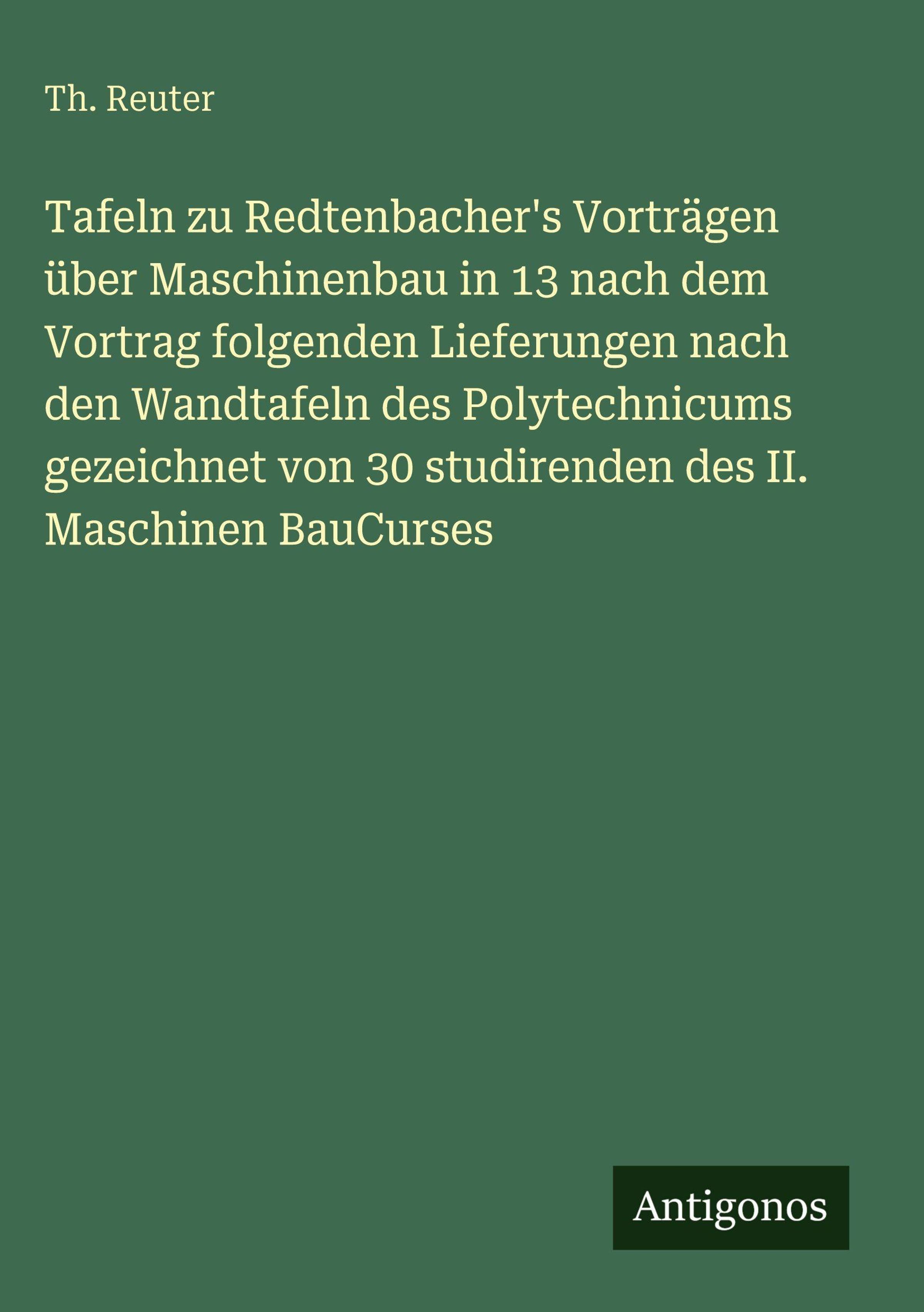 Weitere Ausgaben von Tafeln zu Redtenbacher's Vorträgen über Maschinenbau in 13 nach dem Vortrag folgenden Lieferungen nach den Wandtafeln des Polytechnicums gezeichnet von 30 studirenden des II. Maschinen BauCurses |