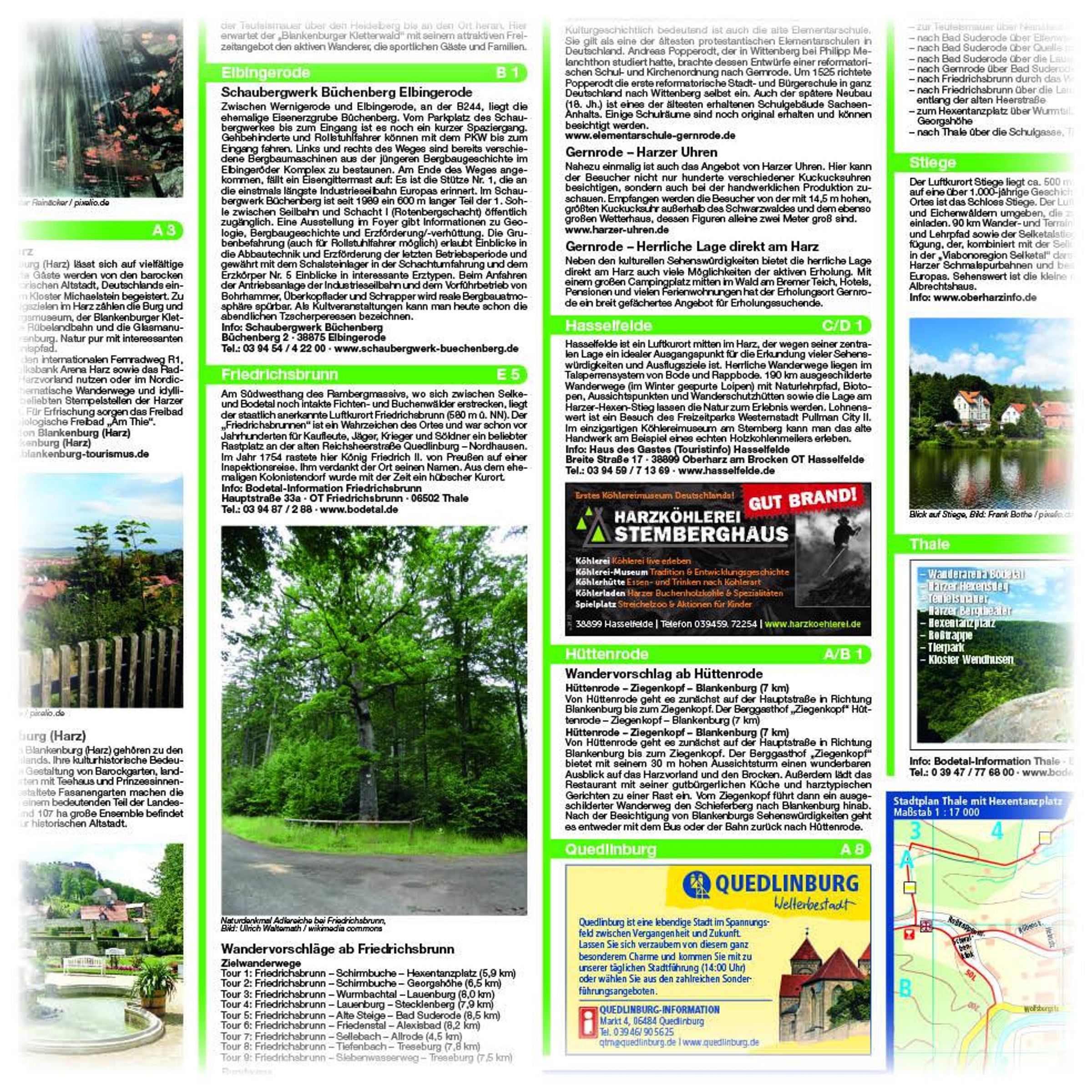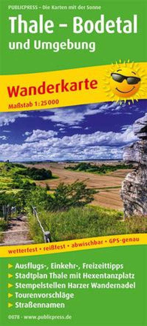 Thale, am Rande des Harzes gelegen, liegt im Zentrum des Kartenausschnitts. Eine Detailkarte über den Ort mit dem per Seilbahn erreichbaren Hexentanzplatz zeigt ihn als idealen Ausgangspunkt für den bekannten Harzer Hexenstieg. Weitere markierte Fernwanderwege lassen den nördlichen Teil des Mittelgebirges gut erkunden. Die Rückseite informiert nicht nur über die Orte mit ihren touristischen Angeboten, sondern macht auch Wandervorschläge für kürzere Strecken.
