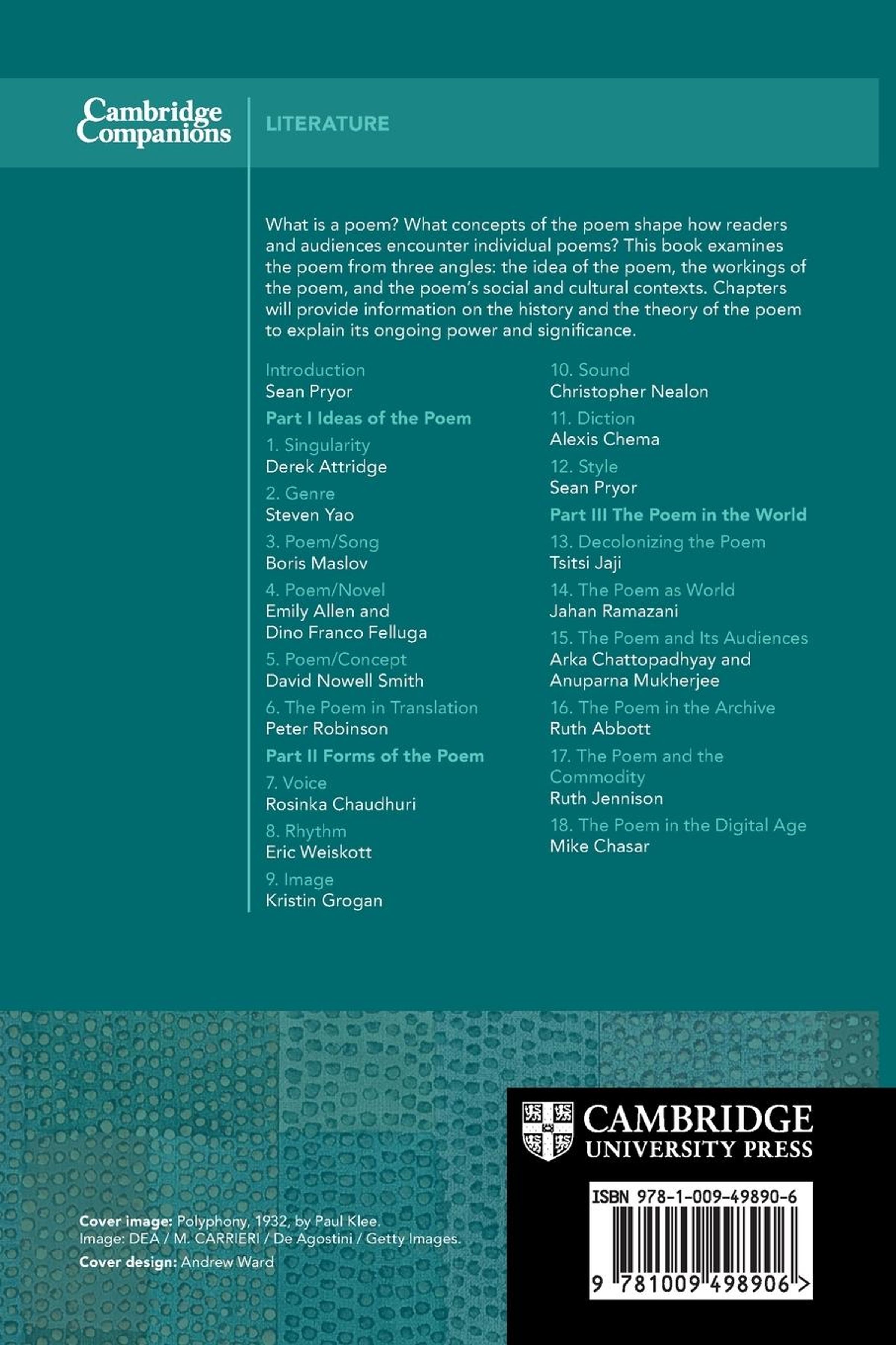 What is a poem? What ideas about the poem as such shape how readers and audiences encounter individual poems? To explore these questions, the first section of this Companion addresses key conceptual issues, from singularity and genre to the poem's historical exchanges with the song and the novel. The second section turns to issues of form, focusing on voice, rhythm, image, sound, diction, and style. The third section considers the poem's social and cultural lives. It examines the poem in the archive and in the digital sphere, as well as in relation to decolonization and global capitalism. The chapters in this volume range across both canonical and non-canonical poems, poems from the past and the present, and poems by a diverse set of poets. This book will be a key resource for students and scholars studying the poem.