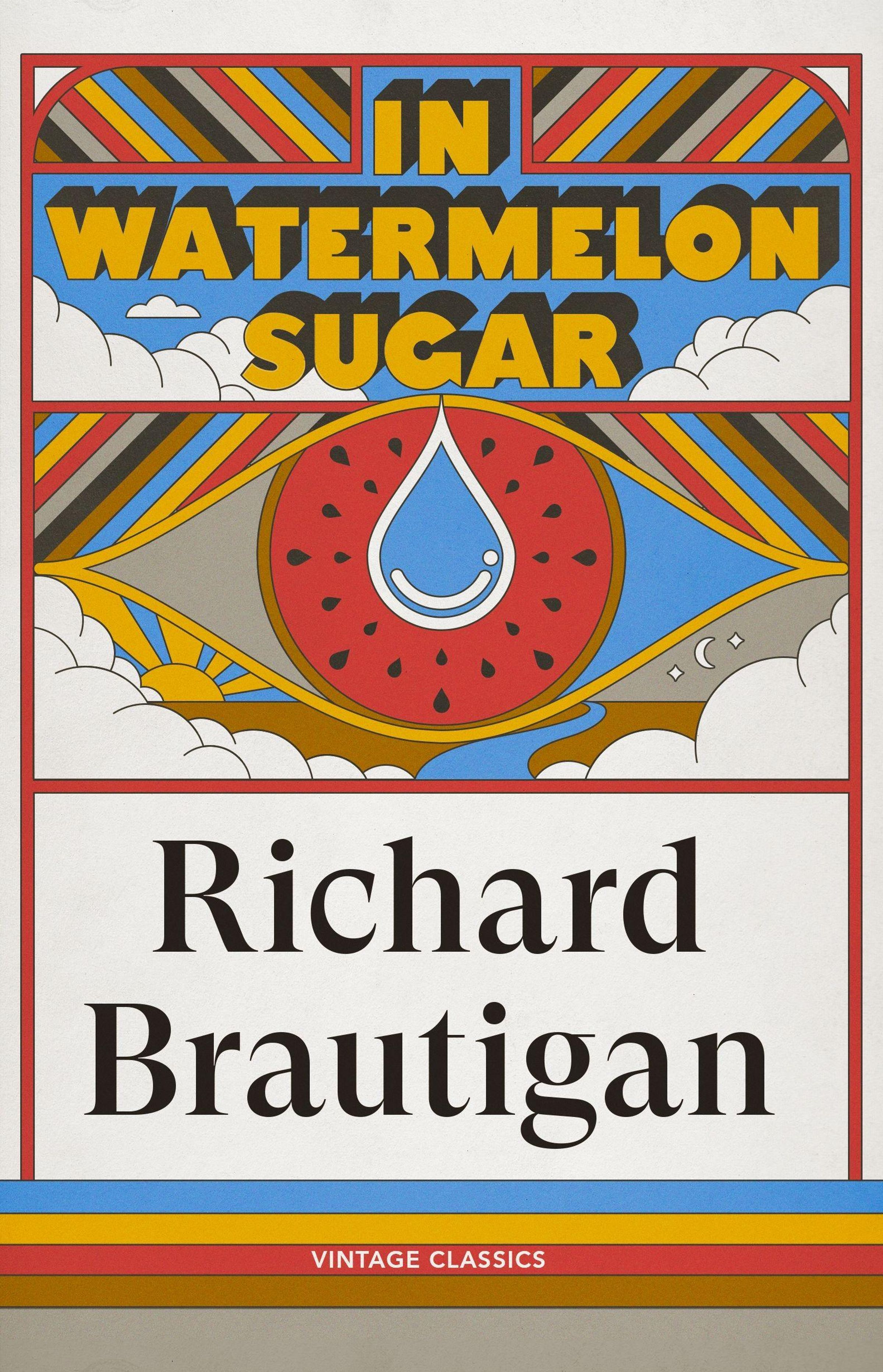 „IN WATERMELON SUGAR“ in gelber Schrift auf blauem Hintergrund, darunter „Richard Brautigan“. Illustration mit Wolken und Melone., Buch