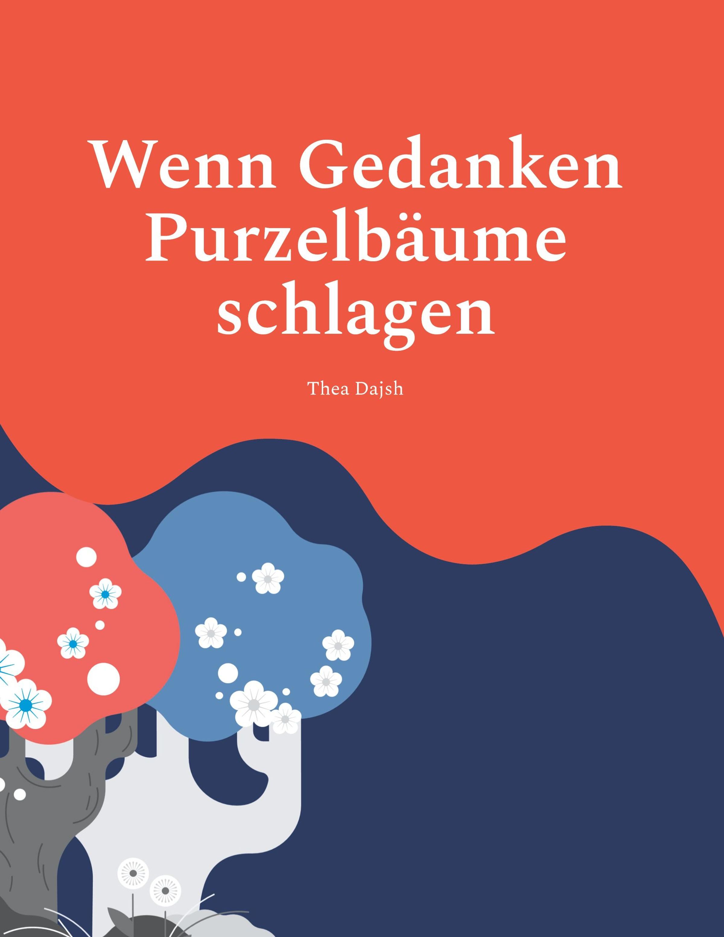 Text: "Wenn Gedanken Purzelbäume schlagen" von Thea Dajsh. Illustration: Bunte Bäume mit Blumen auf farbigem Hintergrund., Buch