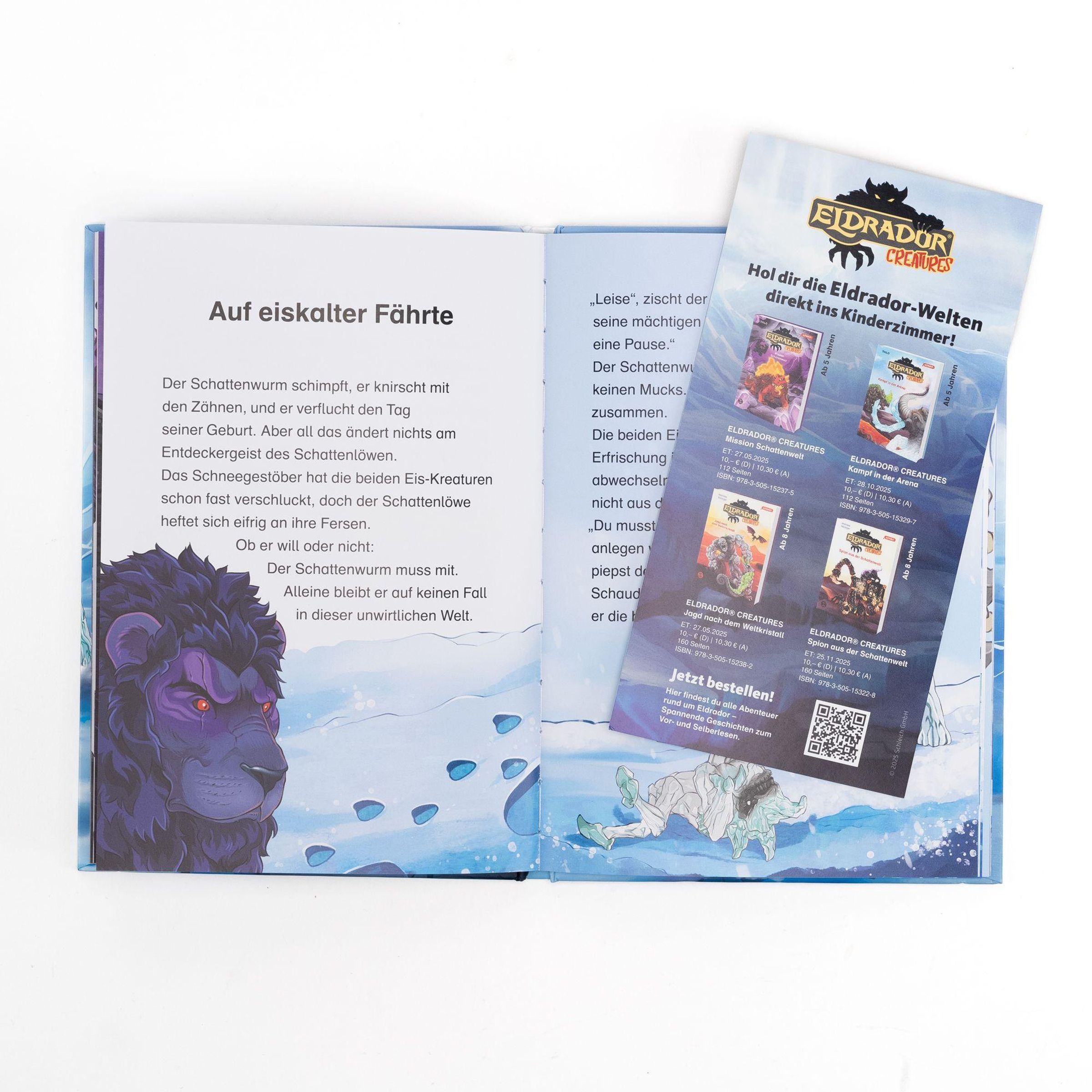 Als die Schattenwesen noch unter sich waren, sagte der Schattendrache ihnen, alles Unbekannte sei gefährlich. Trotzdem wagt sich der Schattenlöwe durch den Spalt in ihrer Welt und traut sich, Licht und Kälte kennenzulernen. Auch wenn er sich überwinden muss, geht der Schattenwurm mit. In der Eiswelt treffen sie das Frostmammut und den Eiskäfer, die gerade ihren Weltenkristall verstecken wollen. Es kommt zum Kampf - und die beiden Schattenwesen haben überraschend eine sehr erfolgreiche Mission erfüllt.