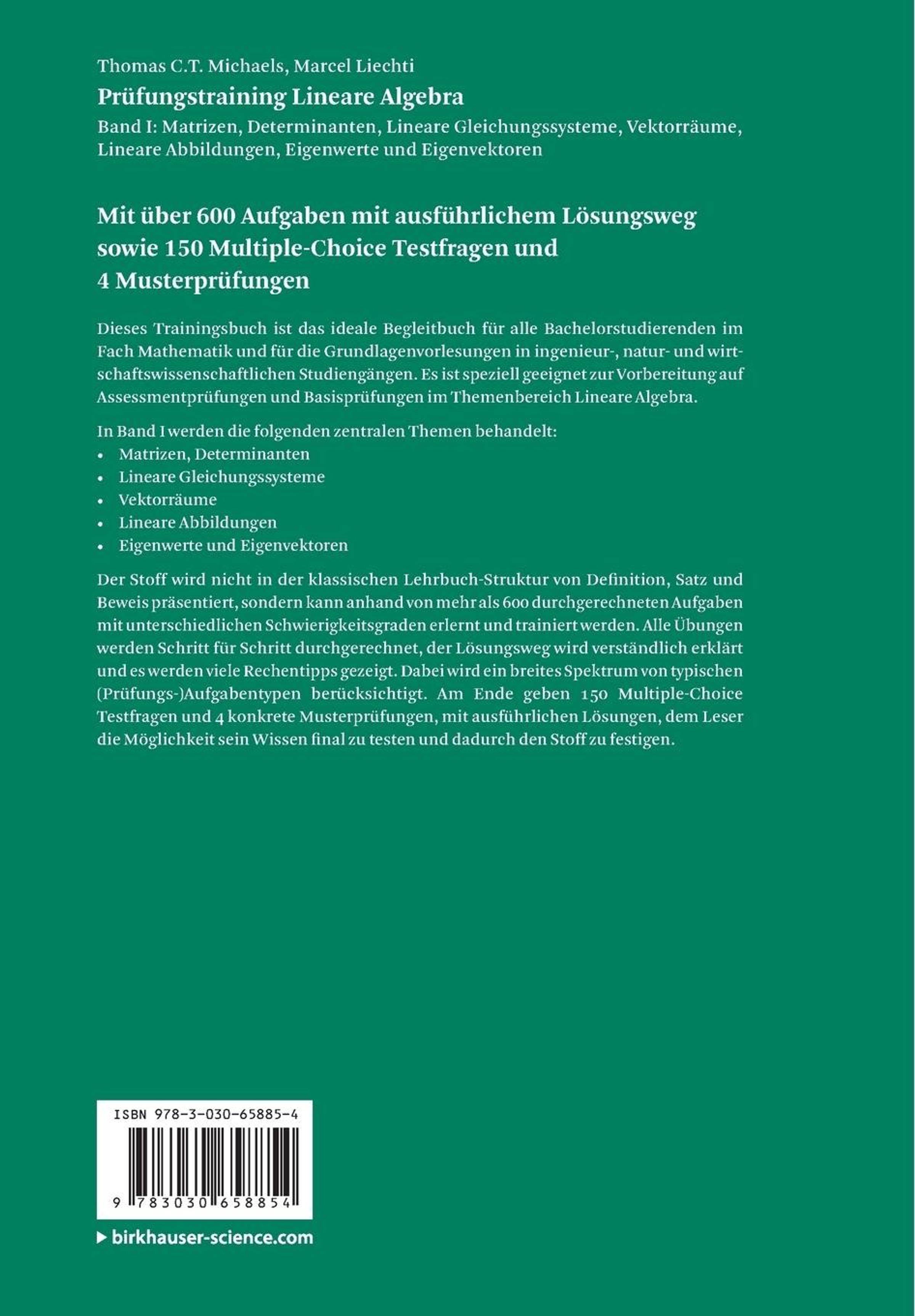 Der Stoff wird nicht in der klassischen Lehrbuch-Struktur von Definition, Satz und Beweis präsentiert, sondern kann anhand von mehr als 600 Aufgaben mit unterschiedlichen Schwierigkeitsgraden erlernt und trainiert werden. Alle Übungen werden Schritt für Schritt durchgerechnet, der Lösungsweg wird verständlich erklärt und es werden viele Rechentipps gezeigt. Dabei wird ein breites Spektrum von typischen (Prüfungs-)Aufgabentypen berücksichtigt. Am Ende geben 150 Multiple-Choice Testfragen und 4 konkrete Musterprüfungen, mit ausführlichen Lösungen, dem Leser die Möglichkeit sein Wissen final zu testen und dadurch den Stoff zu festigen.