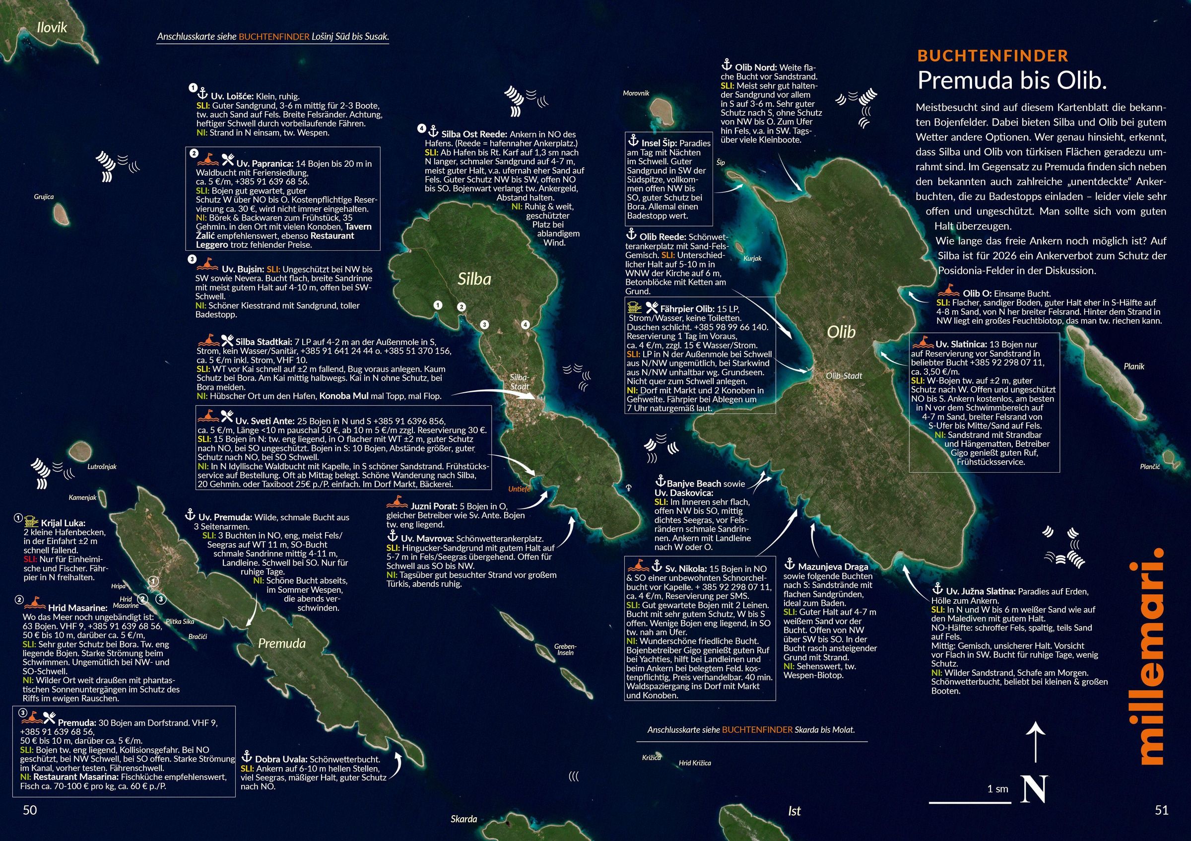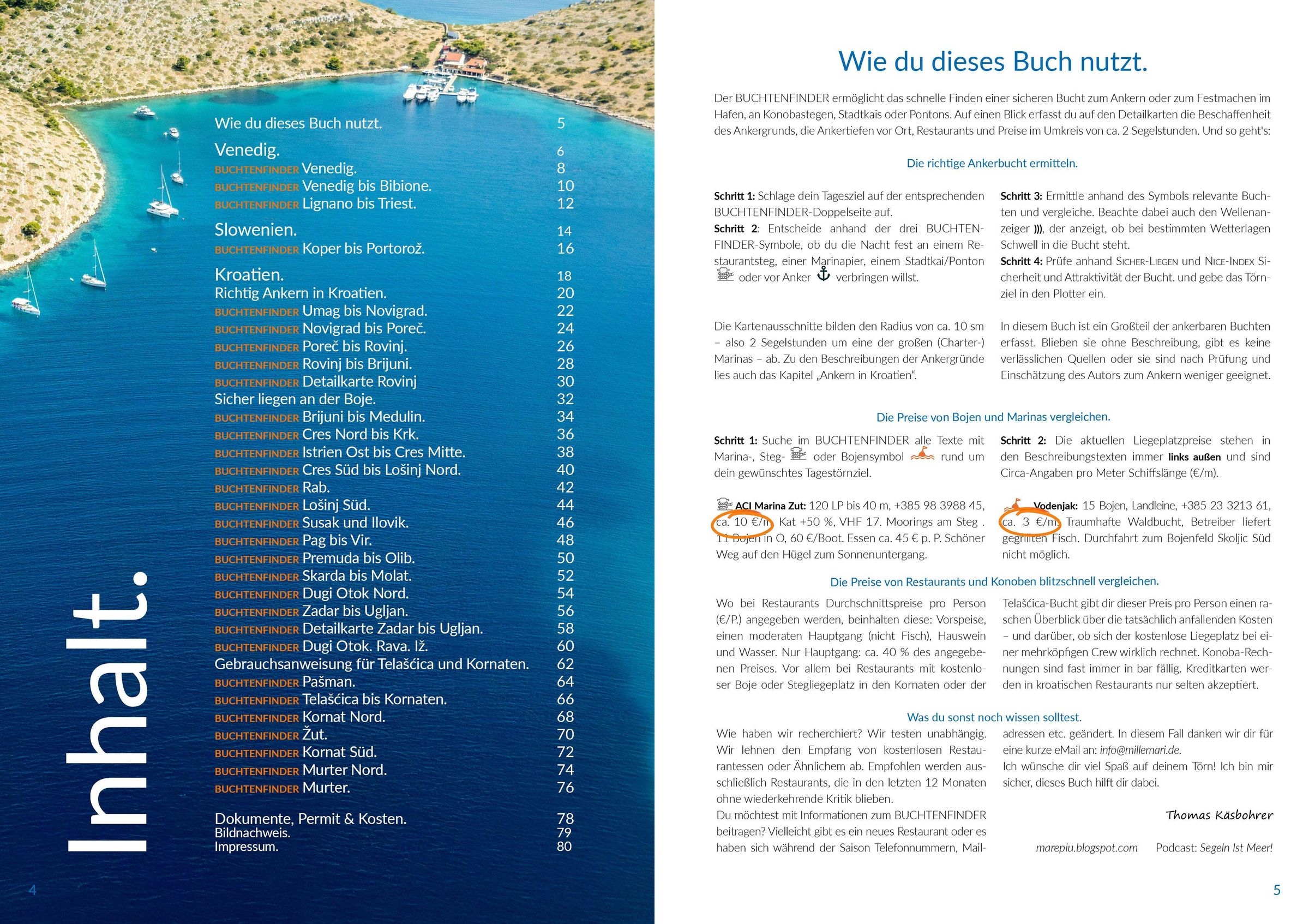 Häfen, Buchten und Bojen Venedig bis Triest. 831 Buchten statt bisher 744. 473 Ankerbuchten statt bisher 388. 82 Inseln 104 Bojenfelder statt bisher 99. 154 Marinas & Stadtkais statt bisher 113. 22 Restaurantstege. ... und die 109 empfehlenswertesten Insel- und Küsten-Konoben.