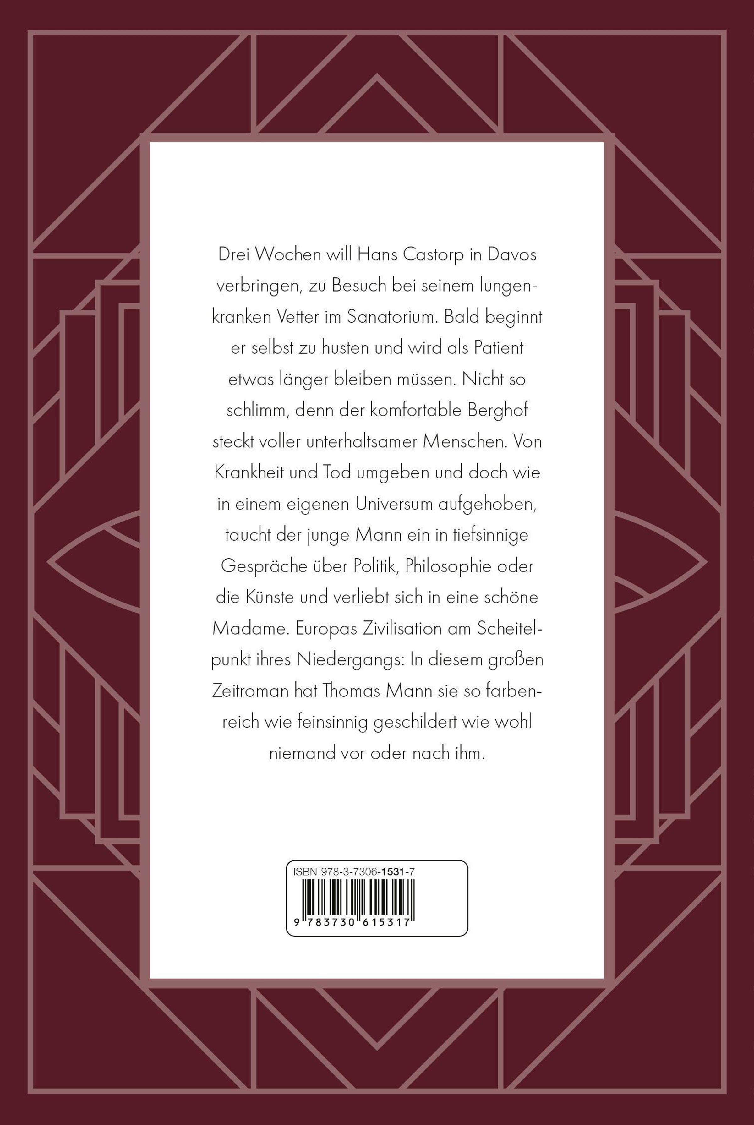 Drei Wochen will Hans Castorp in Davos verbringen, zu Besuch bei seinem lungenkranken Vetter im Sanatorium. Bald beginnt er selbst zu husten und wird als Patient etwas länger bleiben müssen. Nicht so schlimm, denn der komfortable Berghof steckt voller unterhaltsamer Menschen. Von Krankheit und Tod umgeben und doch wie in einem eigenen Universum aufgehoben, taucht der junge Mann ein in tiefsinnige Gespräche über Politik, Philosophie oder die Künste und verliebt sich in eine schöne Madame. Europas Zivilisation am Scheitelpunkt ihres Niedergangs: In diesem großen Zeitroman hat Thomas Mann sie so farbenreich wie feinsinnig geschildert wie wohl niemand vor oder nach ihm.