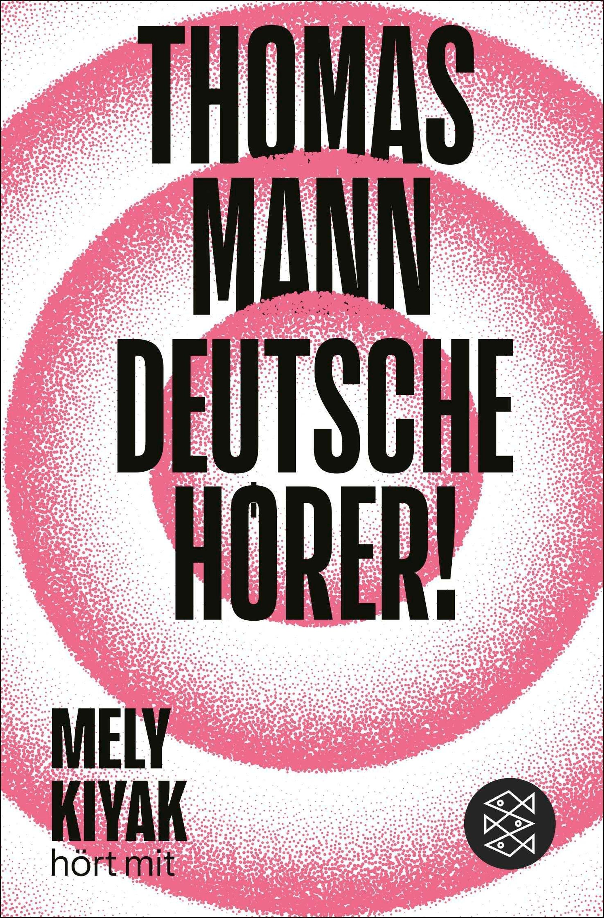 „THOMAS MANN DEUTSCHE HÖRER! MELY KIYAK hört mit“. Rote Kreise auf weißem Hintergrund, unten rechts ein Logo., Buch