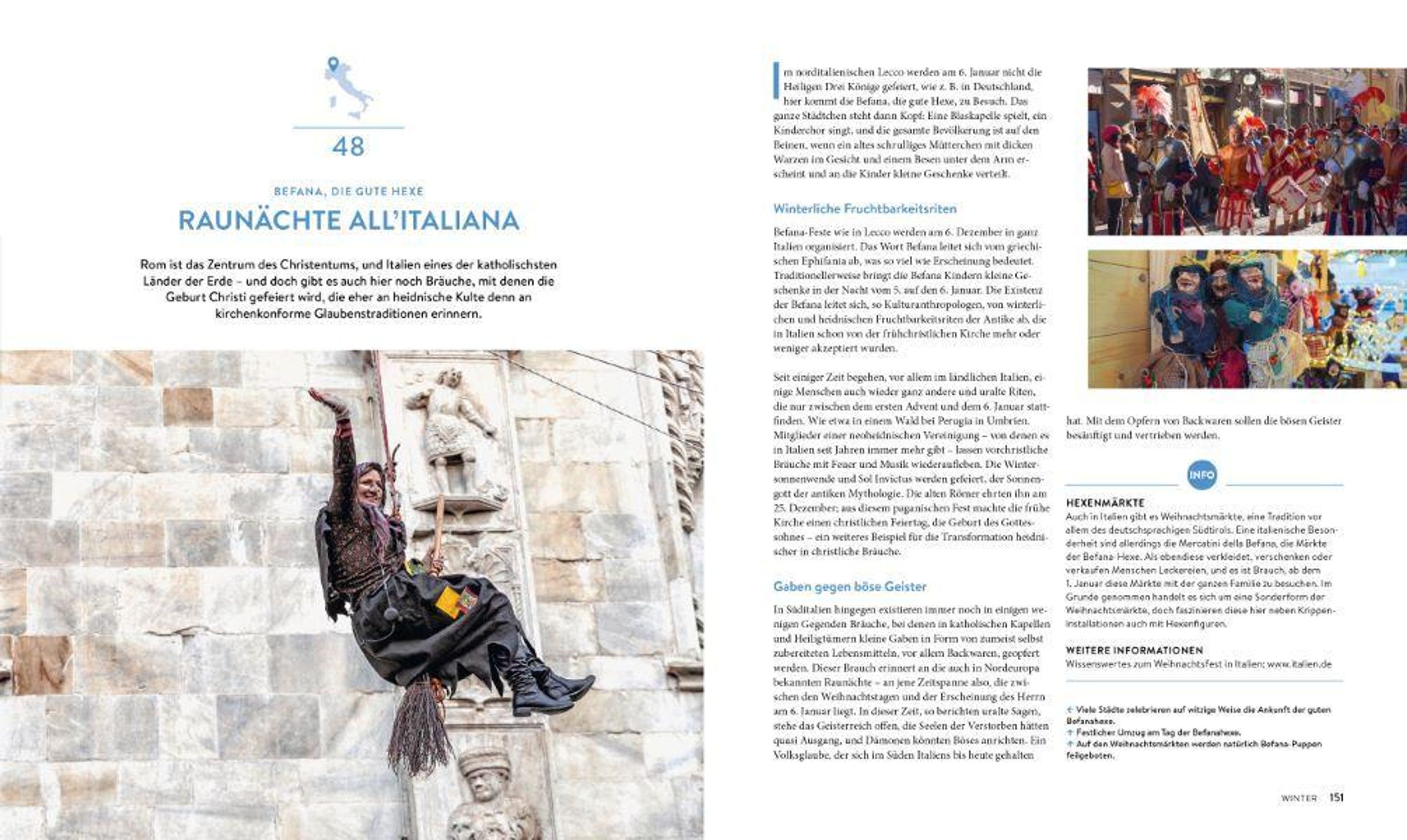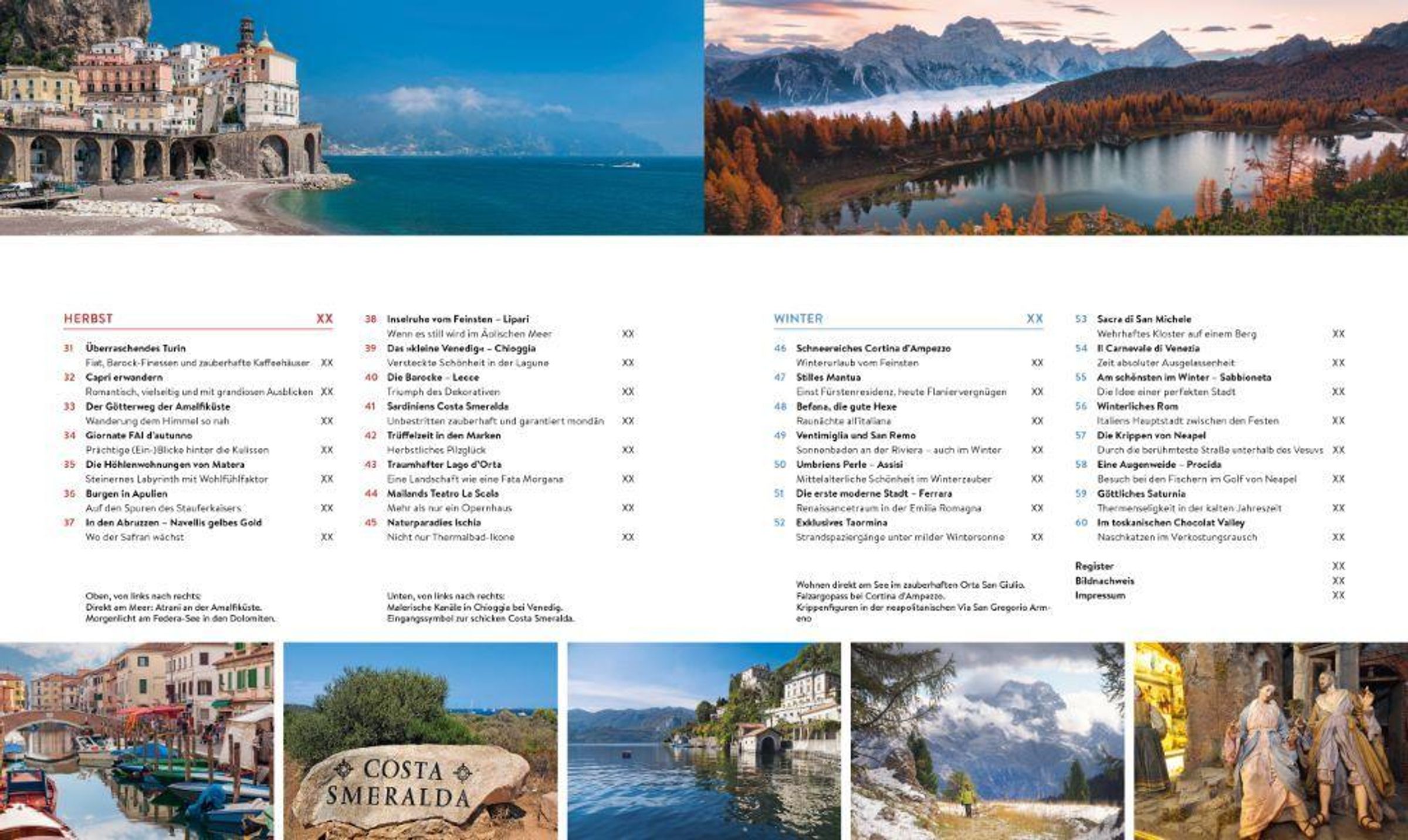 Für jede Jahreszeit das richtige Ziel im Lieblingsreiseland Italien Dieser Reise-Bildband lädt dich ein, Italien zu entdecken - und zwar zur besten Reisezeit! Rom ist natürlich immer eine Reise wert, aber besonders schön ist es dort im Winter, zwischen den Festen. Oder vielleicht möchtest du dich von diesem Buch inspirieren lassen und im Frühling zum Karneval nach Venedig reisen, im Sommer an die sardinische Costa Smeralda oder im Herbst auf Capri wandern gehen? Dieser Reiseführer bietet dir jede Menge saisonal passende Tipps für unvergessliche Italien-Reisen!
