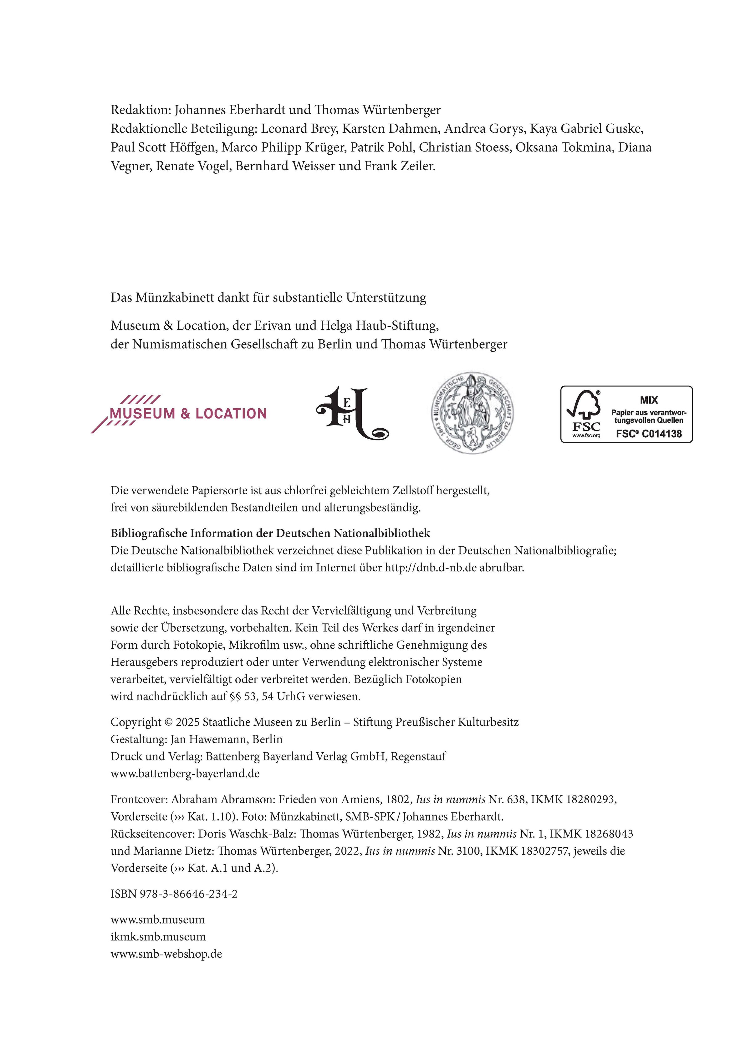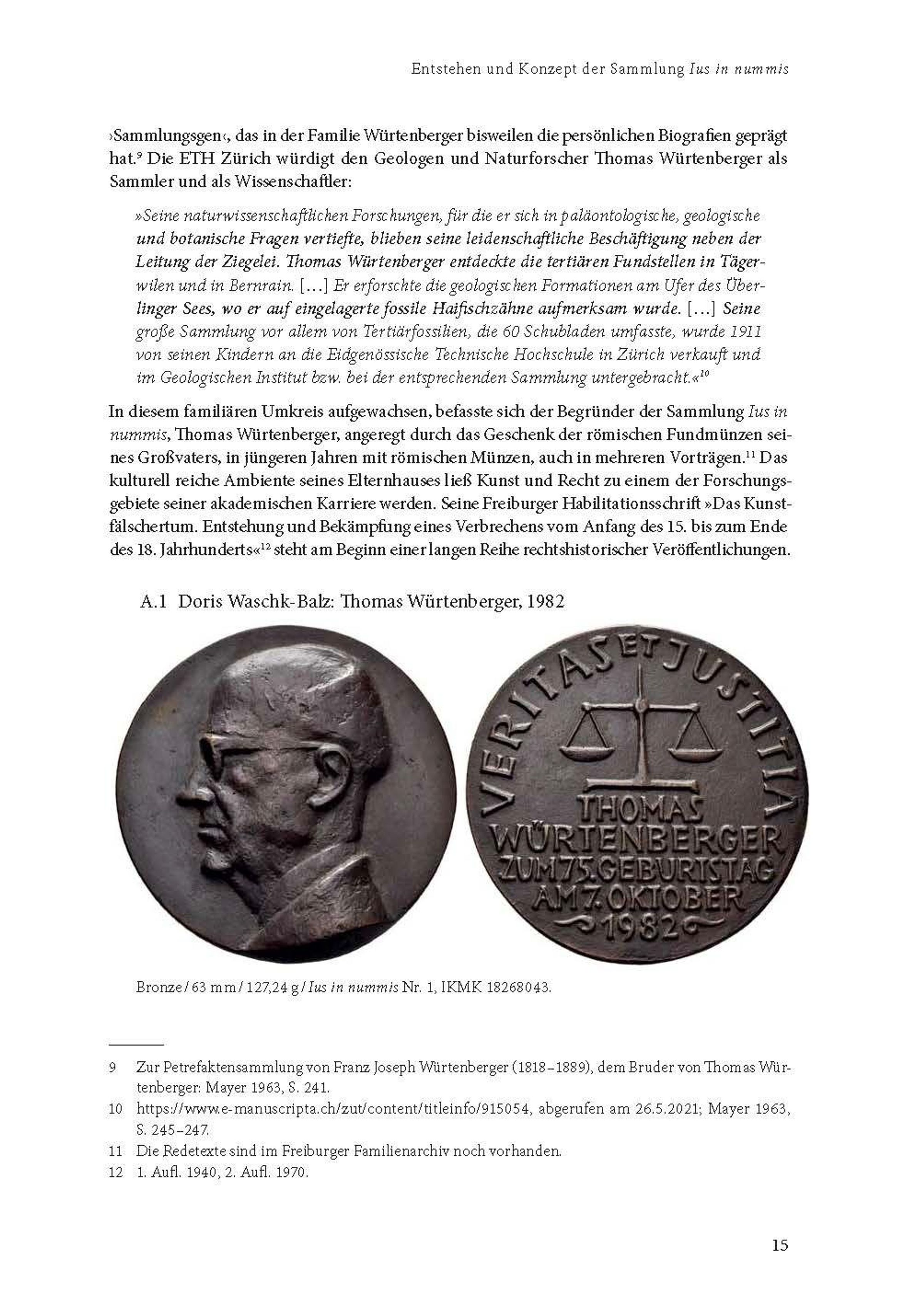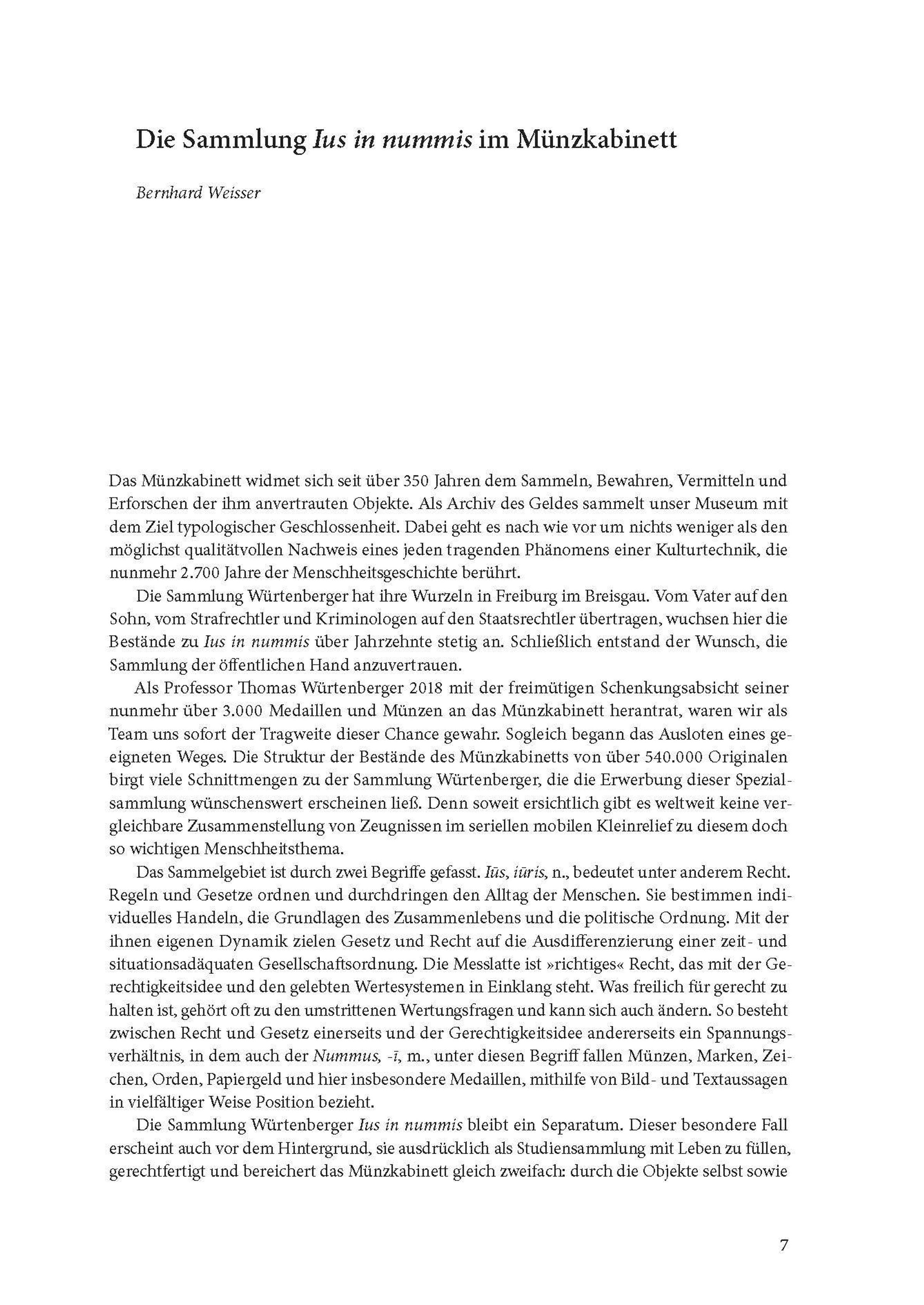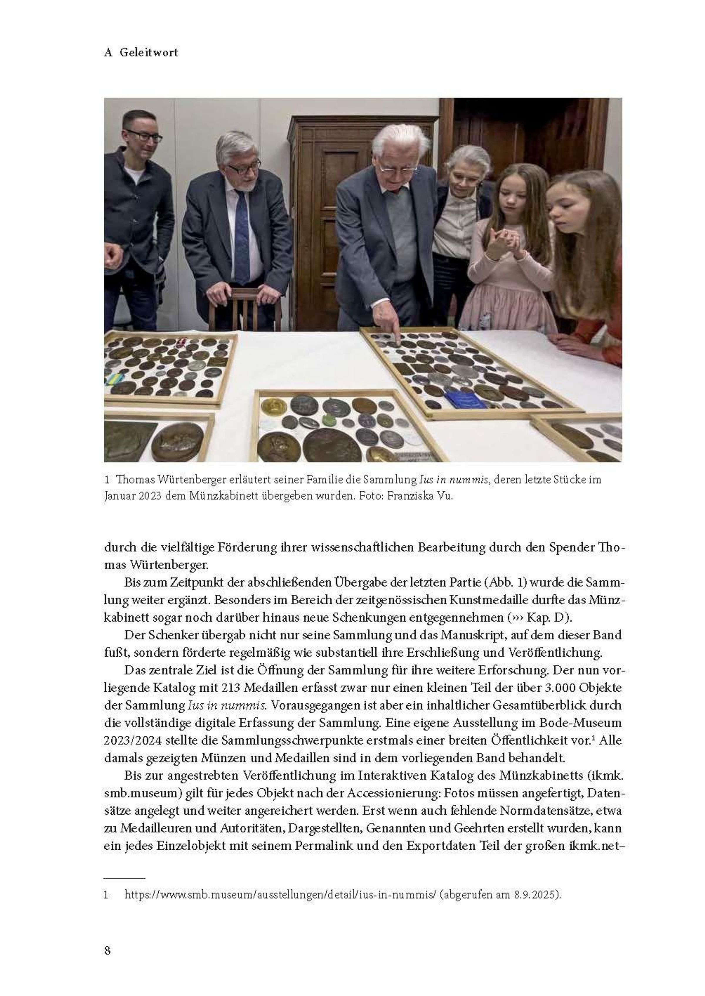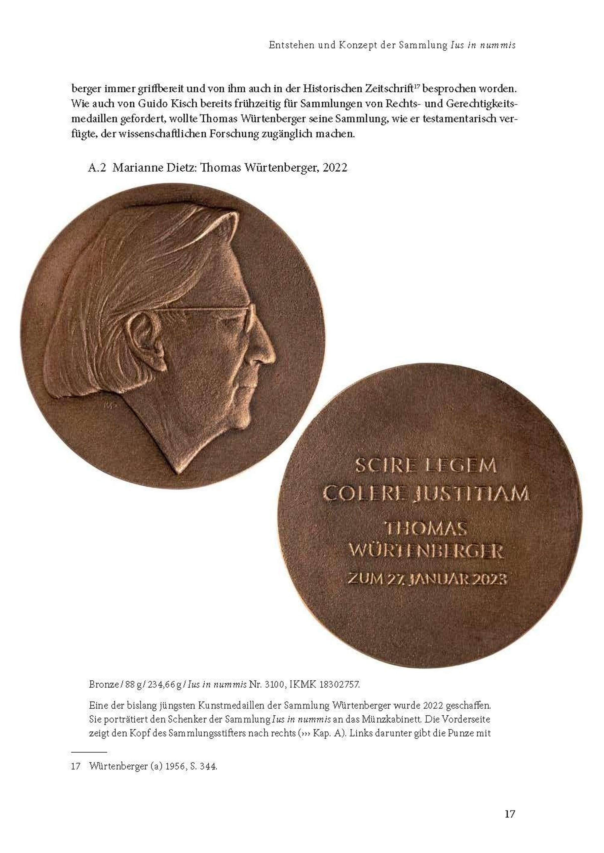 Im Januar 2023 wurde dem Münzkabinett der Staatlichen Museen zu Berlin (Preußischer Kulturbesitz) die Sammlung "Ius in nummis" des Freiburger Rechtswissenschaftlers Professor Dr. Thomas Würtenberger als Schenkung überlassen. Sie umfasst mit über 3000 Medaillen das größte zusammenhängende Corpus mit Bezügen zu Recht, Gerechtigkeit sowie Parlaments- und Verfassungsgeschichte. Der Sammlungsfokus auf Westeuropa in zunehmend globaler Perspektive erlaubt vielfältige Einblicke in die Geschichte medialer Inszenierungen von Rechtskultur. Der Katalog stellt die Fragestellung der Sammlung vor. Er präsentiert und kontextualisiert über 400 Schlüsselstücke mit Konzentration auf Rechtskulturen der atlantischen Welt und fragt nach Perspektiven einer weiterführenden Auswertung der Medaillen als rechtshistorische Quellen.