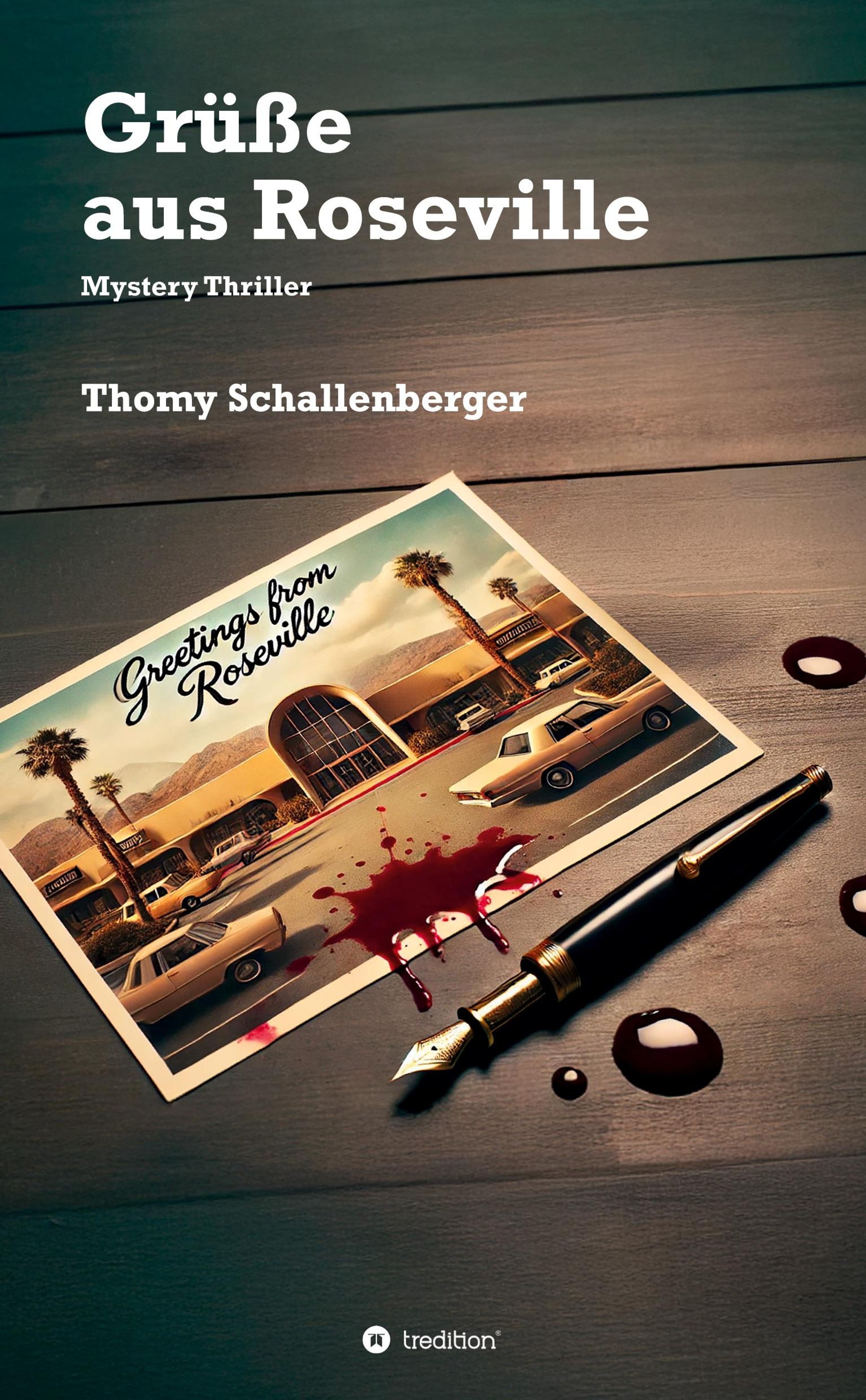 Auf einem dunklen Holztisch liegt eine blutverschmierte Postkarte neben einem Füllfederhalter., Buch