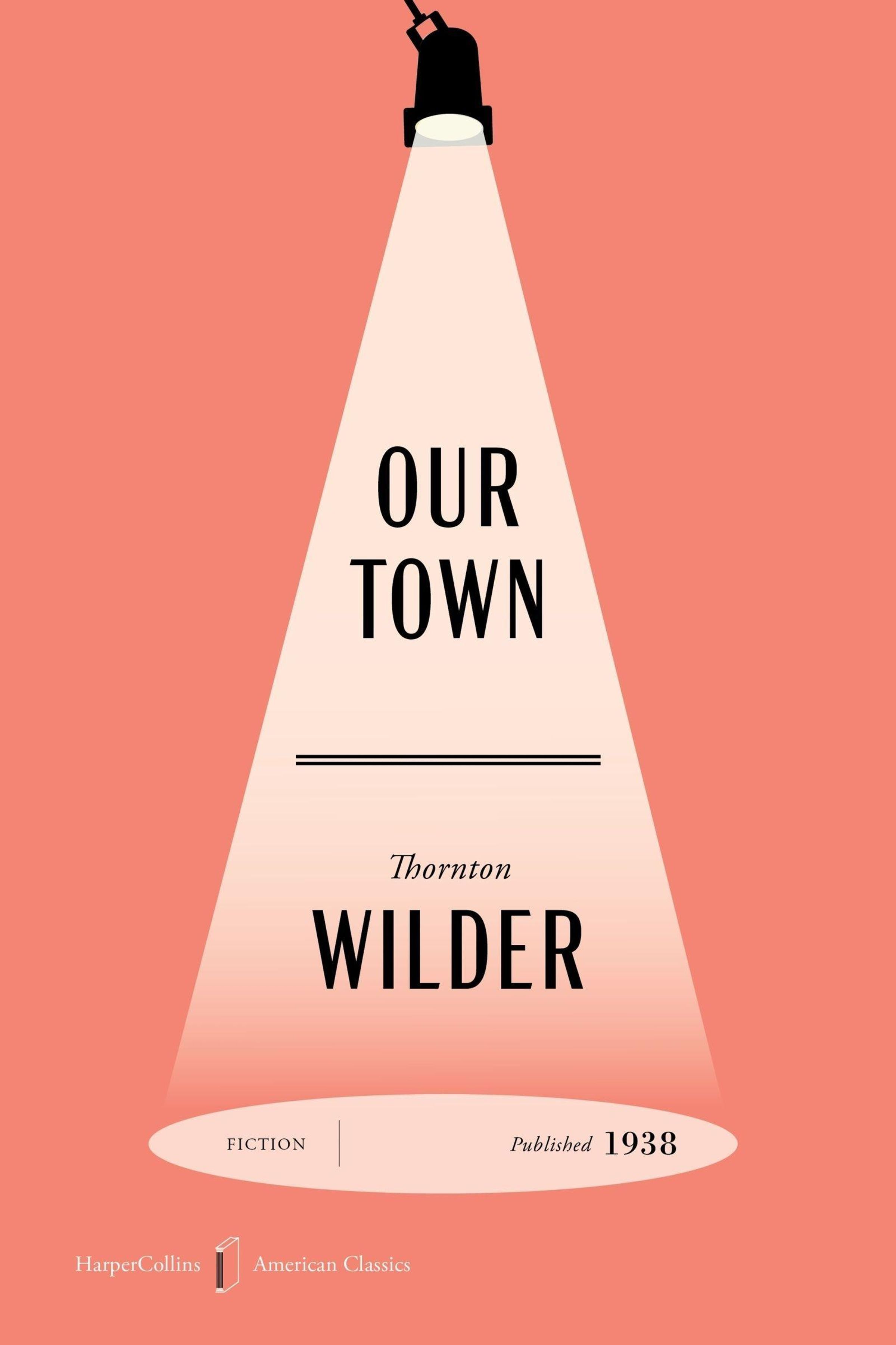 "OUR TOWN", Autor: Thornton Wilder, veröffentlicht 1938. Rosa Hintergrund, Spotlight-Illustration nach unten leuchtend., Buch