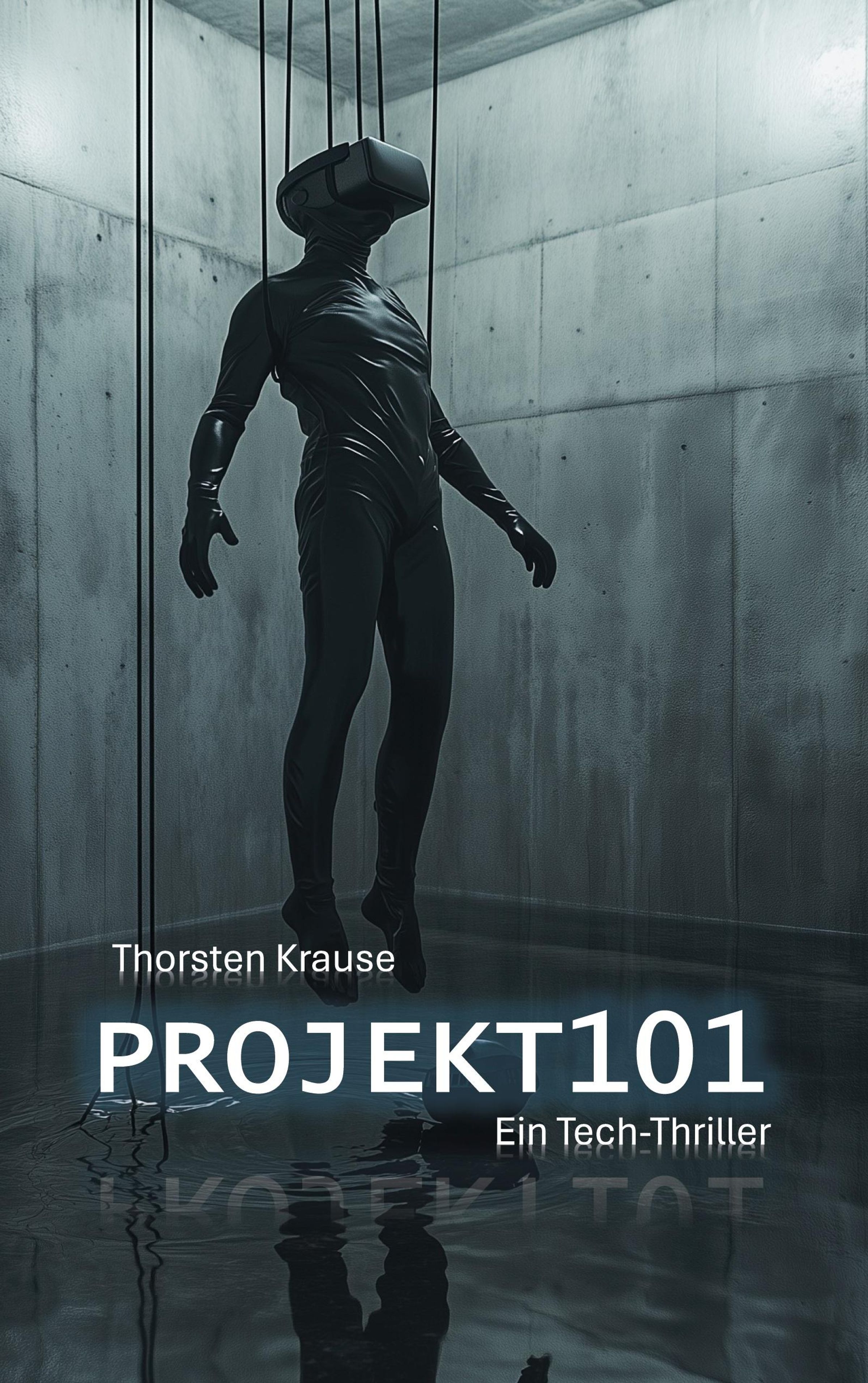 Text: "Thorsten Krause, PROJEKT101, Ein Tech-Thriller." Ein dunkler Raum mit einer an Kabeln hängenden Person in VR-Ausrüstung., Buch