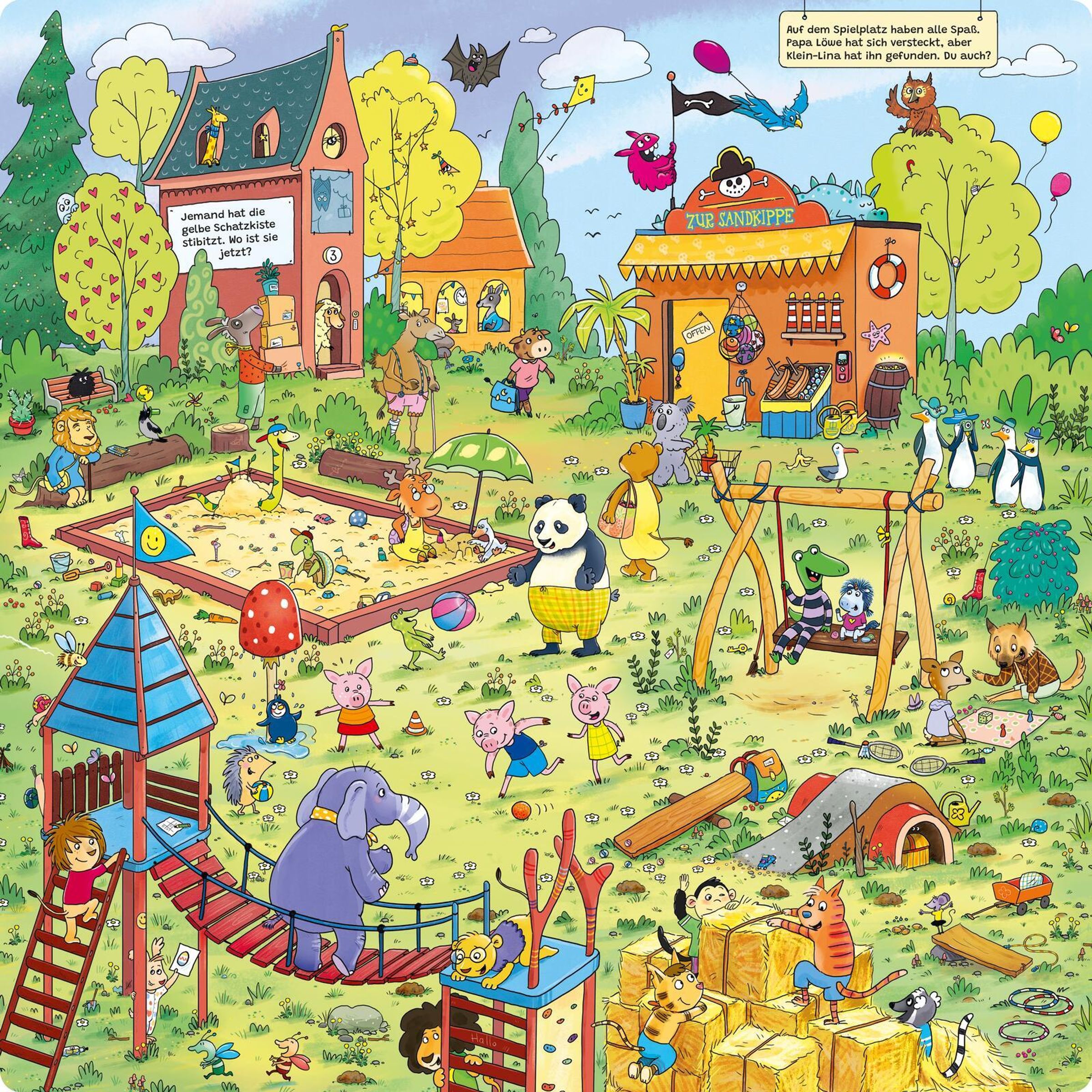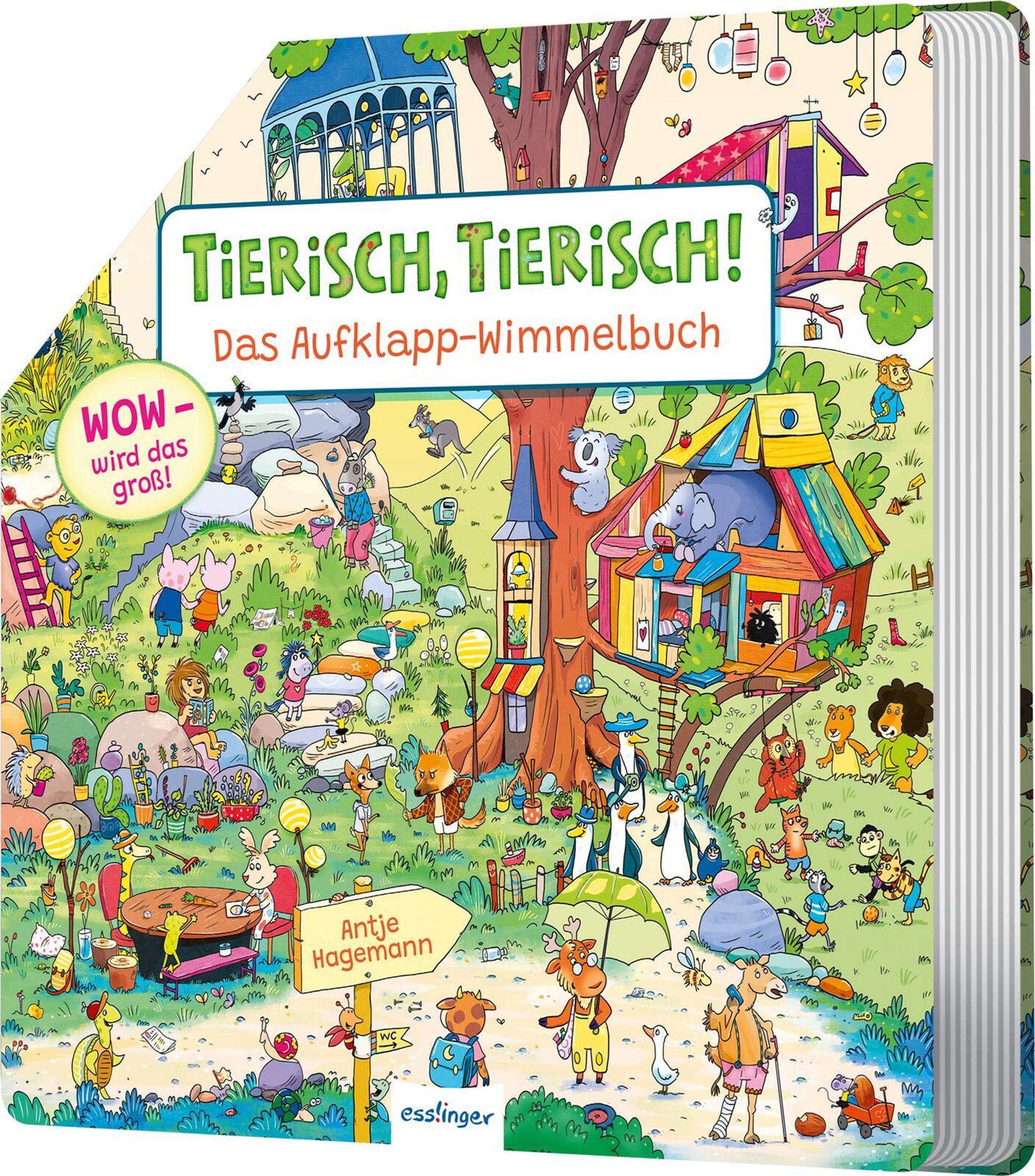 „Tierisch, Tierisch! Das Aufklapp-Wimmelbuch.“ Illustration von Tieren und einem Baumhaus in einer lebendigen Naturkulisse., Buch