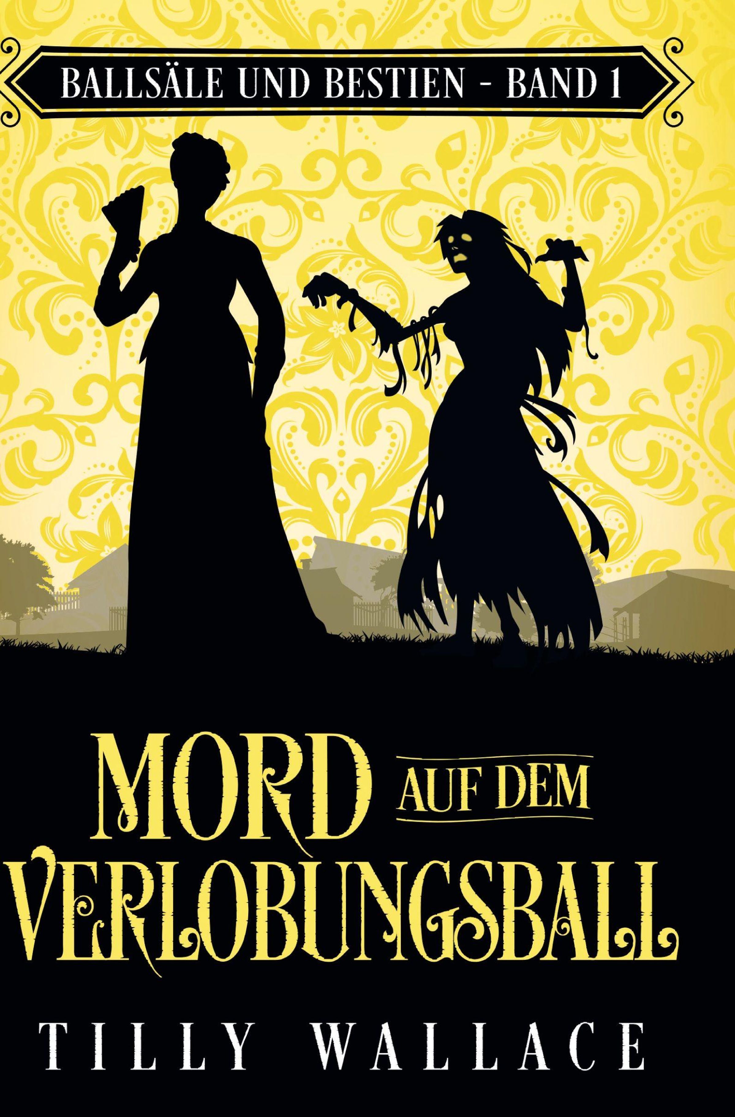 „BALLSÄLE UND BESTIEN - BAND 1“, „MORD AUF DEM VERLOBUNGSBALL“, „TILLY WALLACE“. Zwei Silhouetten vor gelbem Hintergrund., Buch
