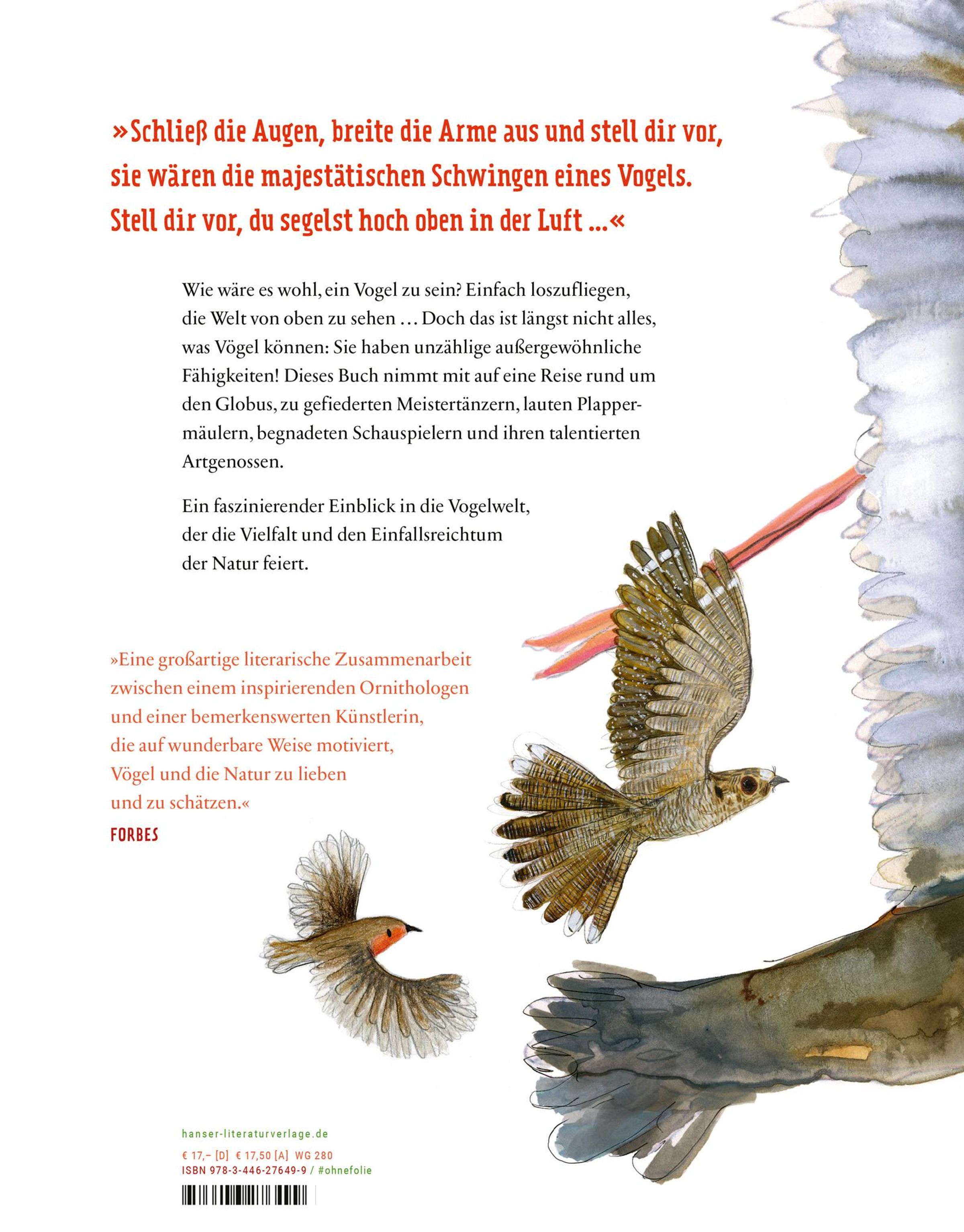 Die Welt der Vögel steckt voll ungeahnter Talente! Wie ist es wohl, ein Vogel zu sein? Sich einfach in die Lüfte zu schwingen, die Welt von oben zu sehen ... Doch das ist längst nicht alles: Vögel legen einige außergewöhnliche und faszinierende Verhaltensweisen an den Tag! Dieses Buch nimmt mit auf eine Reise rund um den Globus, zu gefiederten Meistertänzern, lauten Plappermäulern und begnadeten Schauspielern. Man erfährt, wie die Rothuhnmutter hungrige Füchse austrickst und die Schnepfe tagelang ohne Pause fliegen kann, dass der Honiganzeiger mit Menschen zusammenarbeitet, um an seine süße Leibspeise zu kommen, und vieles mehr. Perfekt für alle, die Vögel und die Natur lieben; wunderschön illustriert von Catherine Rayner.