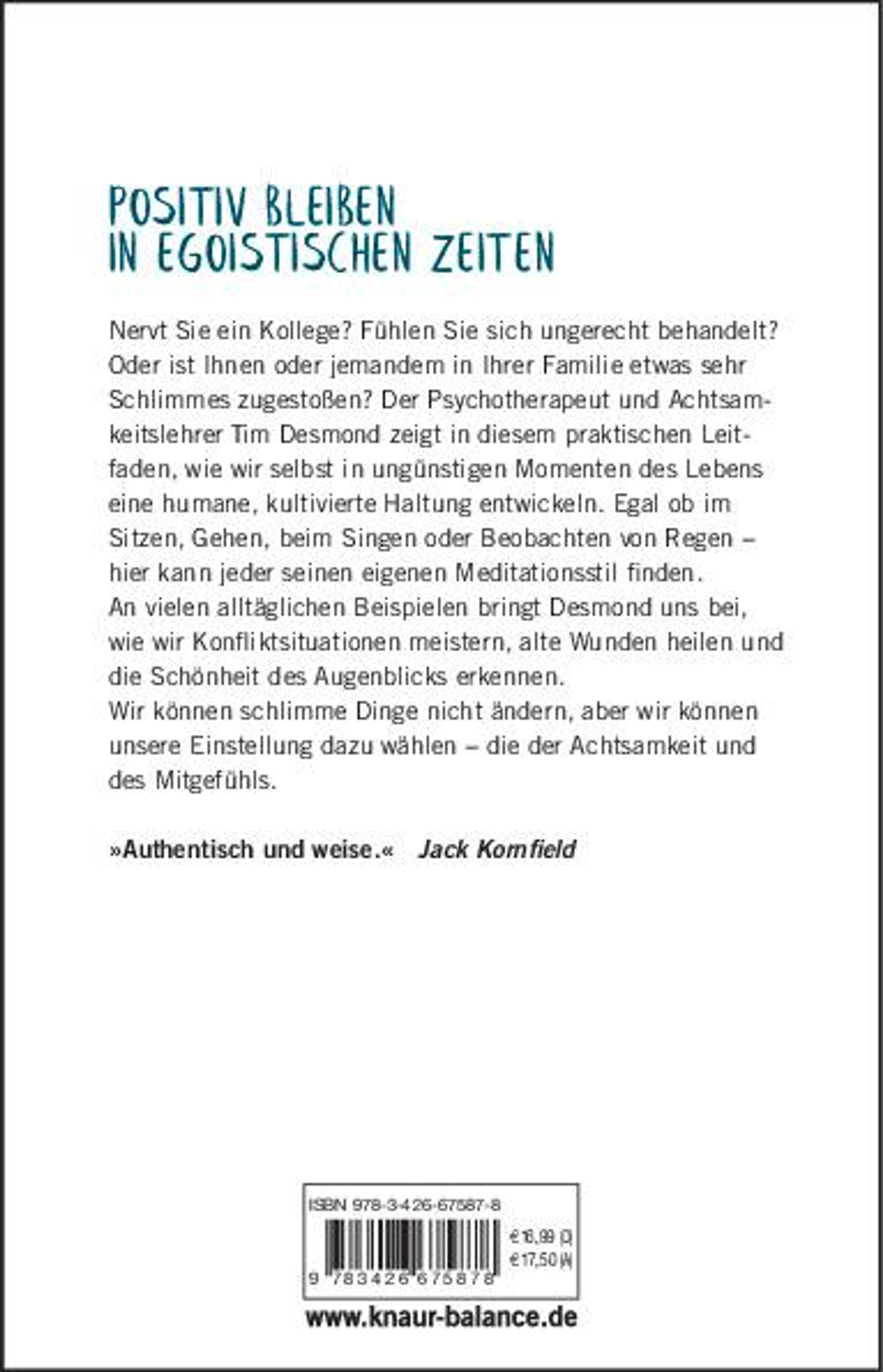 Der Psychotherapeut und Achtsamkeitslehrer Tim Desmond zeigt, wie wir selbst in ungünstigen Momenten des Lebens eine humane, kultivierte Haltung bewahren. Nervt Sie ein Kollege? Fühlen Sie sich ungerecht behandelt? Oder ist Ihnen oder jemandem in Ihrer Familie etwas sehr Schlimmes zugestoßen?