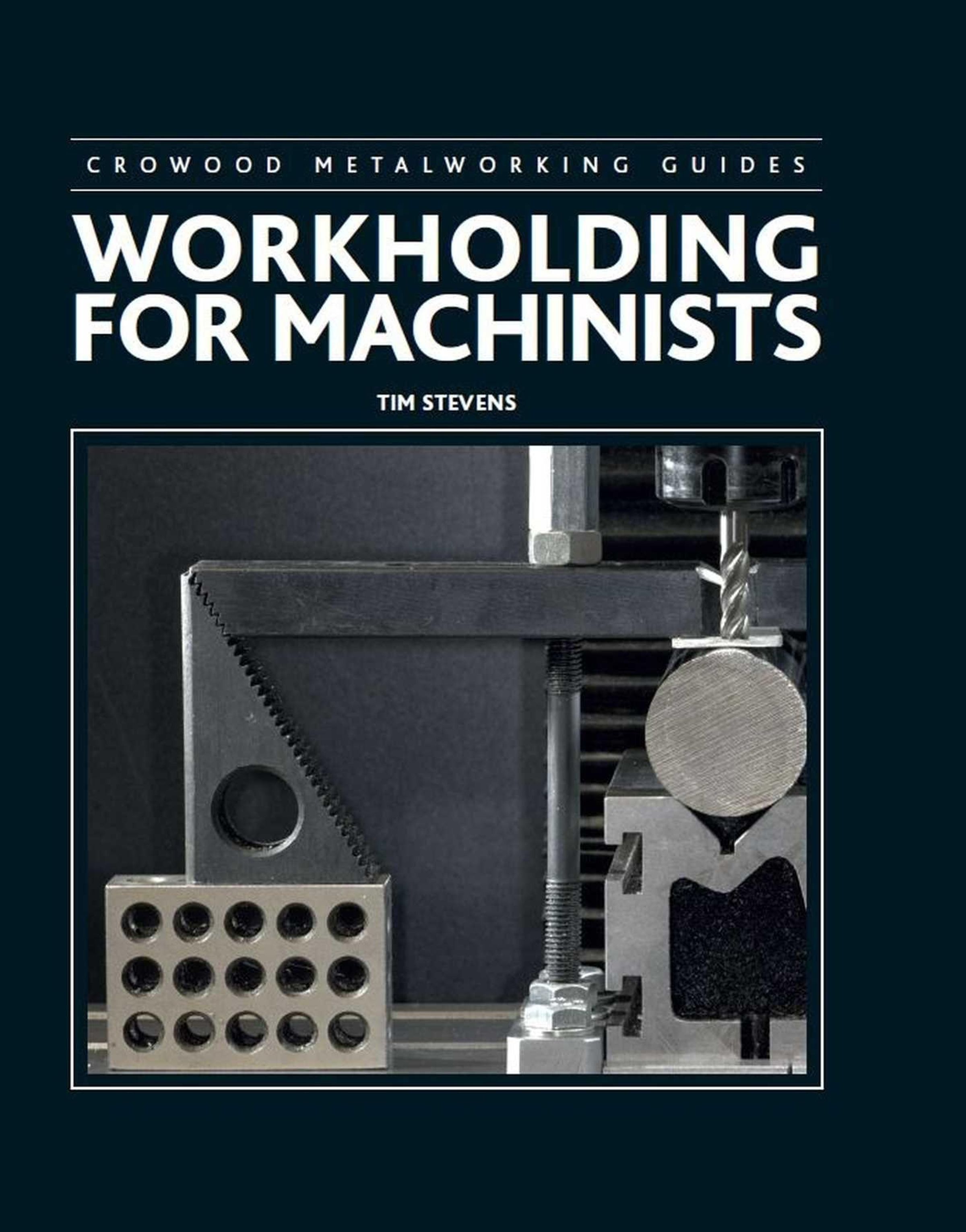 Text: "WORKHOLDING FOR MACHINISTS" von Tim Stevens. Darunter metallene Werkzeuge in einer technischen Anordnung., Buch