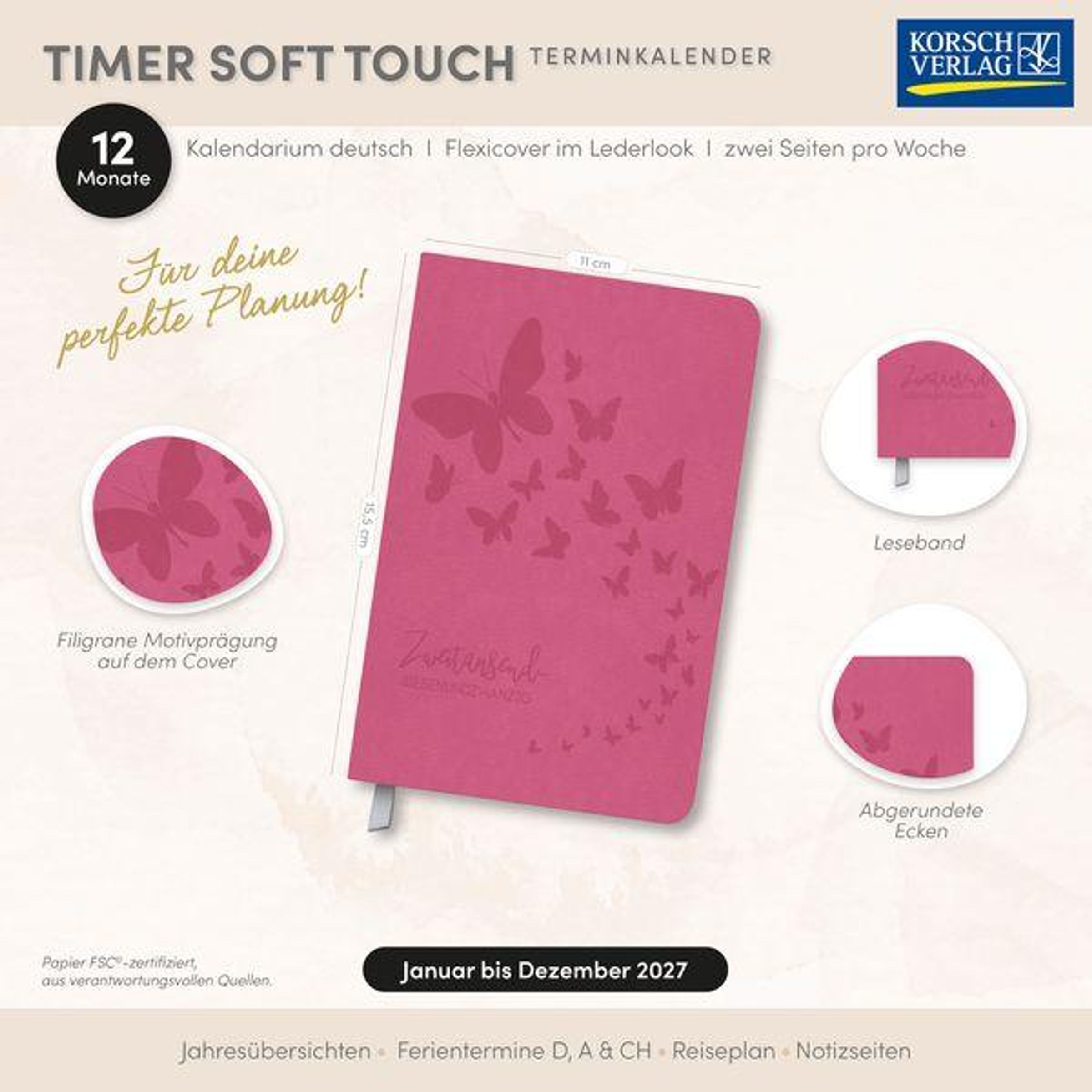 Dieser trendige Timer sieht nicht nur gut aus, er fühlt sich auch gut an. Sein weicher Einband im Lederlook mit filigraner Motivprägung verführt dazu, den Kalender nicht mehr aus der Hand legen zu wollen. Ein 12-monatiges, deutschsprachiges Kalendarium, 128 Seiten, pro Woche 2 Seiten mit viel Platz für Notizen und Leseband runden diesen hochwertigen Taschenkalender ab.