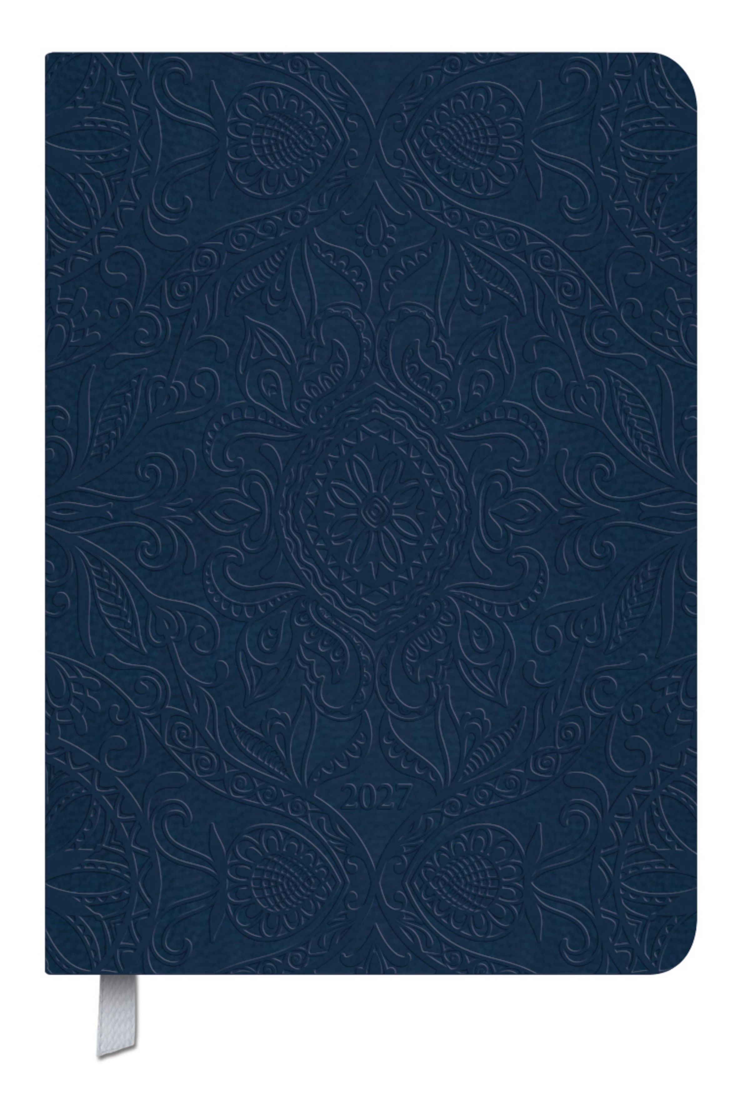 Text: "2027". Dunkelblaue Oberfläche mit floralem, geprägtem Muster. Ein Stoffbändchen unten sichtbar., Buch