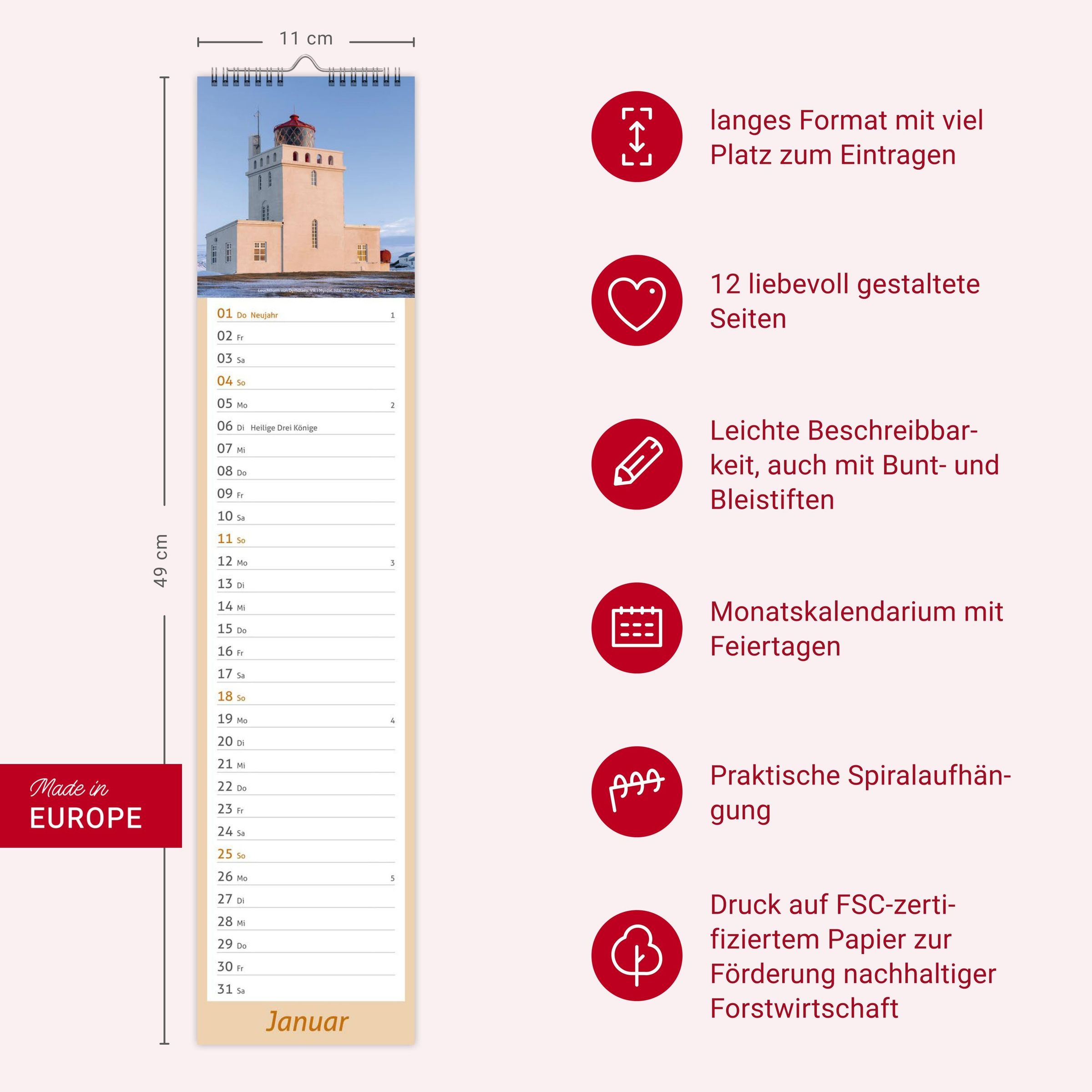 Praktischer Langplaner mit hübschen Leuchtturm-Motiven und übersichtlichem Kalendarium für Eintragungen.