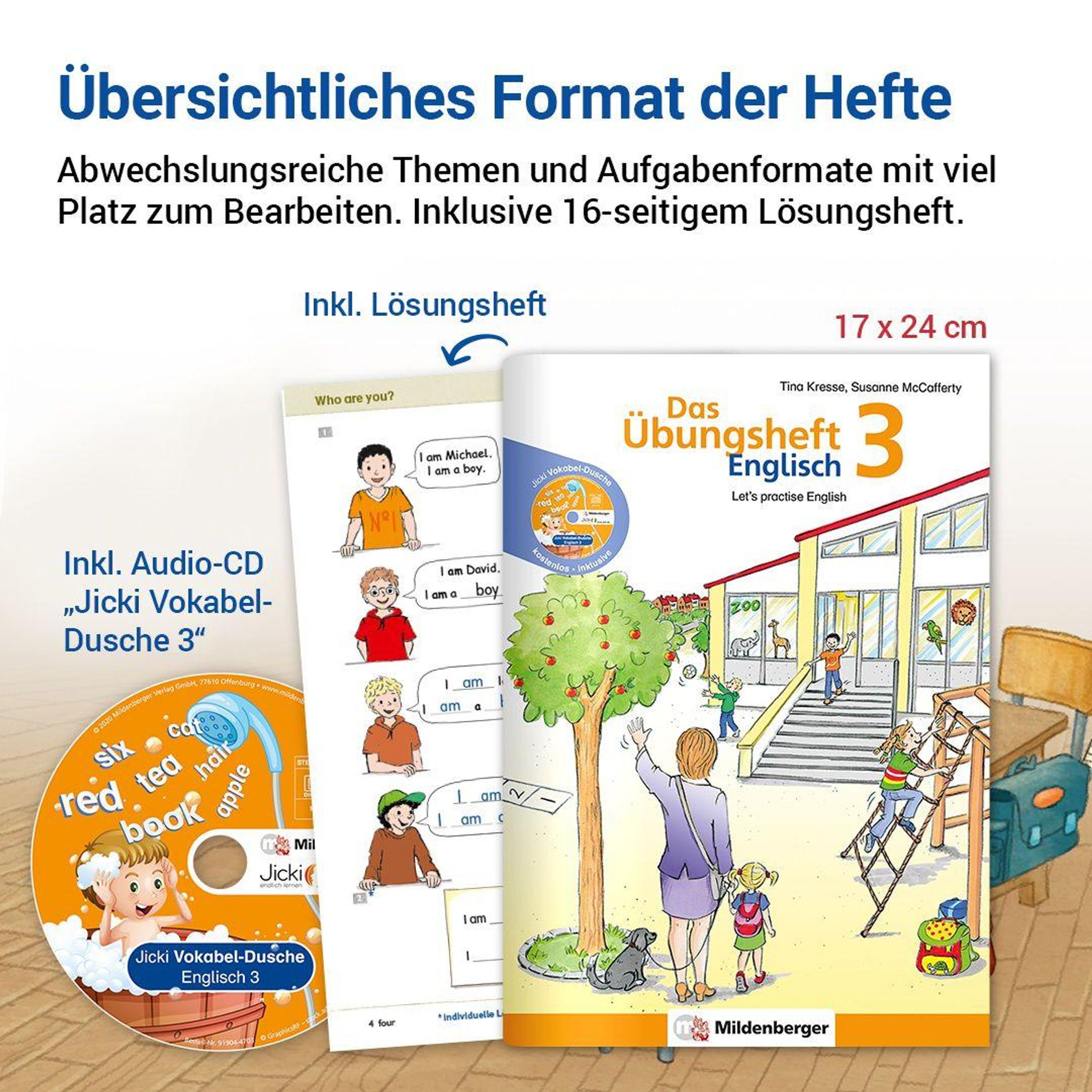 - 64 S., Gh, 17 x 24 cm, vierf., mit Kartonbeilage, Stickerbogen und Lösungsheft, mit Audio-CD "Jicki Vokabel-Dusche 3"