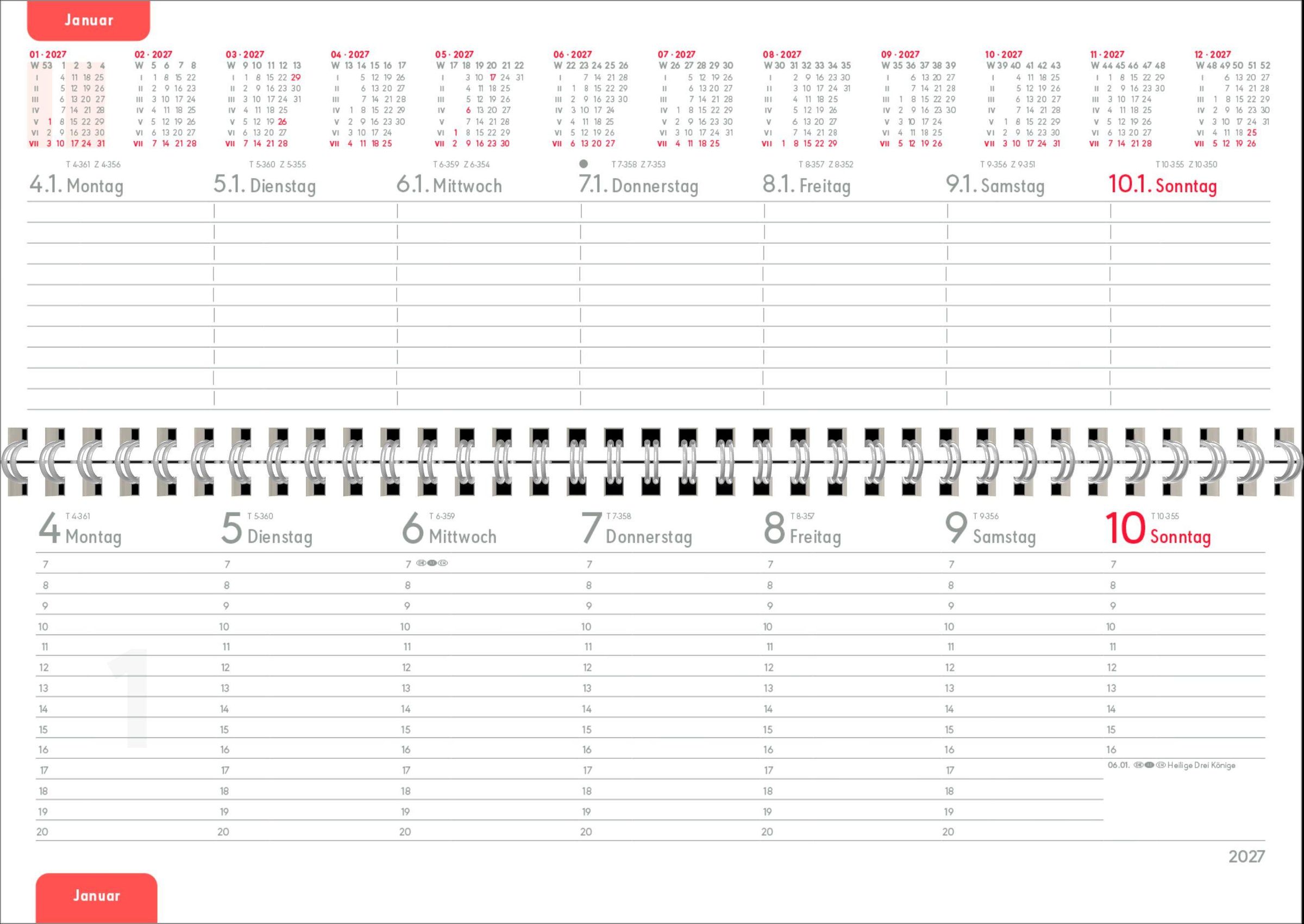 Übersichtliches Kalendarium: 1 Woche auf 2 Seiten -- obere Seite mit Notizfläche & Jahresübersicht, untere Seite mit Zeiteinteilung 8--21 Uhr