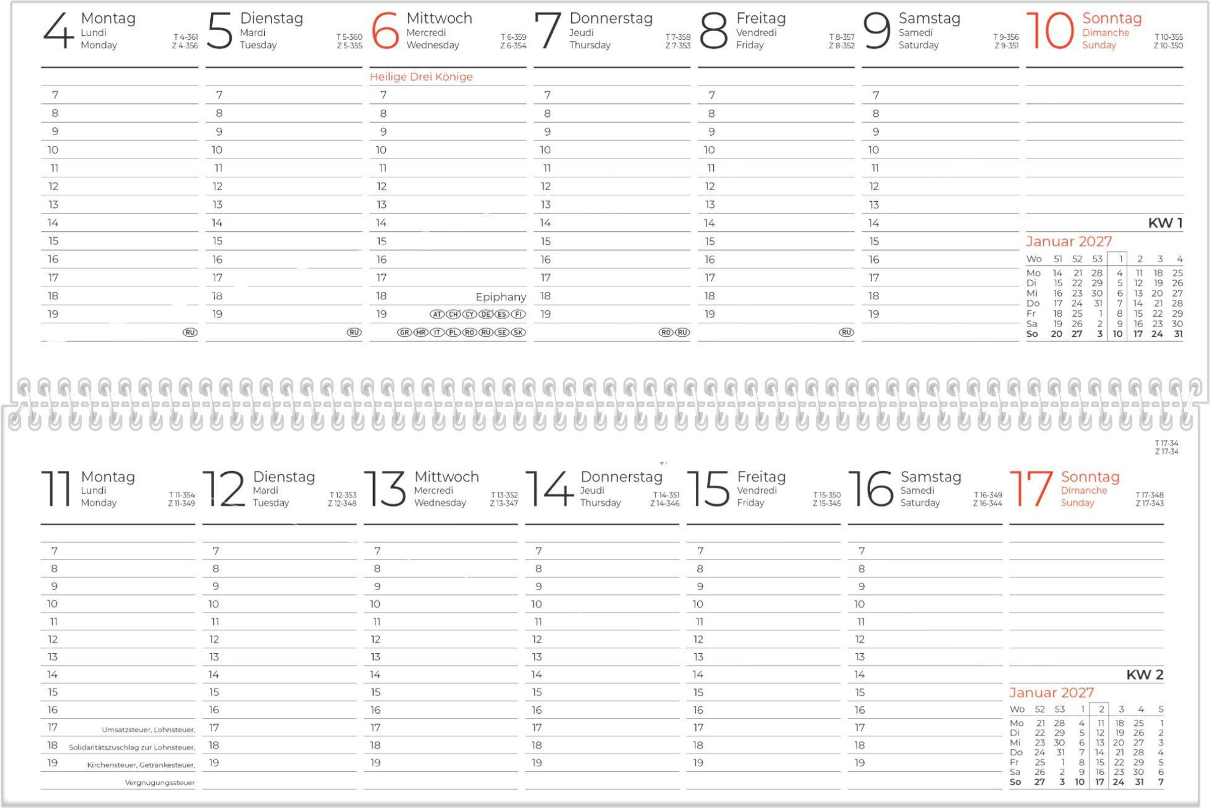 Der Tischkalender Classic black 2027 von Zettler ist der ideale Tischquerkalender für alle, die ihre Woche klar und unkompliziert planen möchten. Im schlichten, professionellen Design bietet jede Seite eine komplette Woche -- übersichtlich strukturiert und mit ausreichend Raum für kurze Eintragungen. Praktische Zusatzinformationen machen den Kalender besonders alltagstauglich: Neben Feiertagen findest du auch Steuertermine sowie eine Tages-, Wochen- und Zinstagezählung -- perfekt fürs Büro oder Homeoffice.