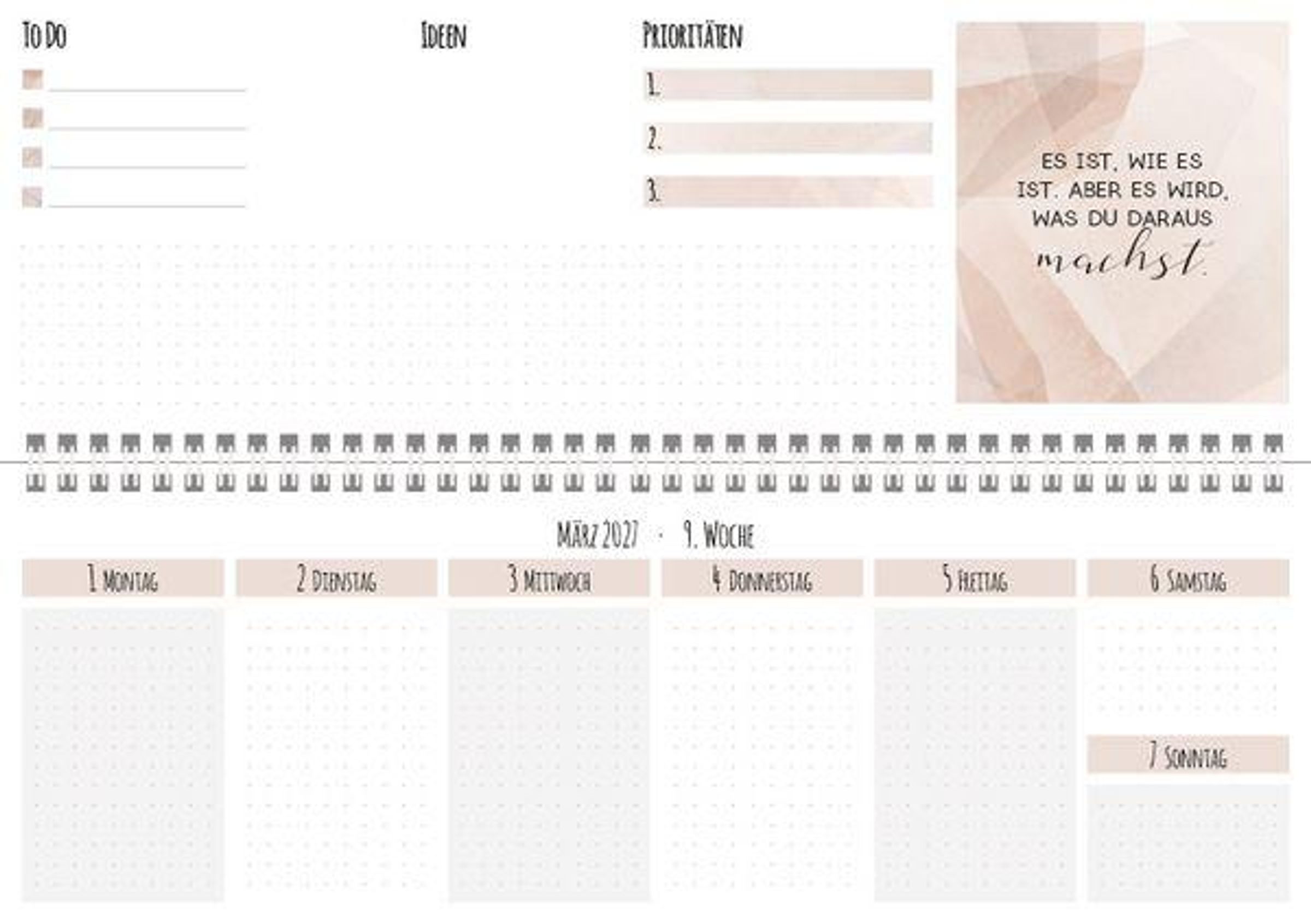 - Jede Woche auf einer Doppelseite mit Listen für wöchentliche To-dos und Prioritäten sowie Raum für Notizen und spontane Ideen