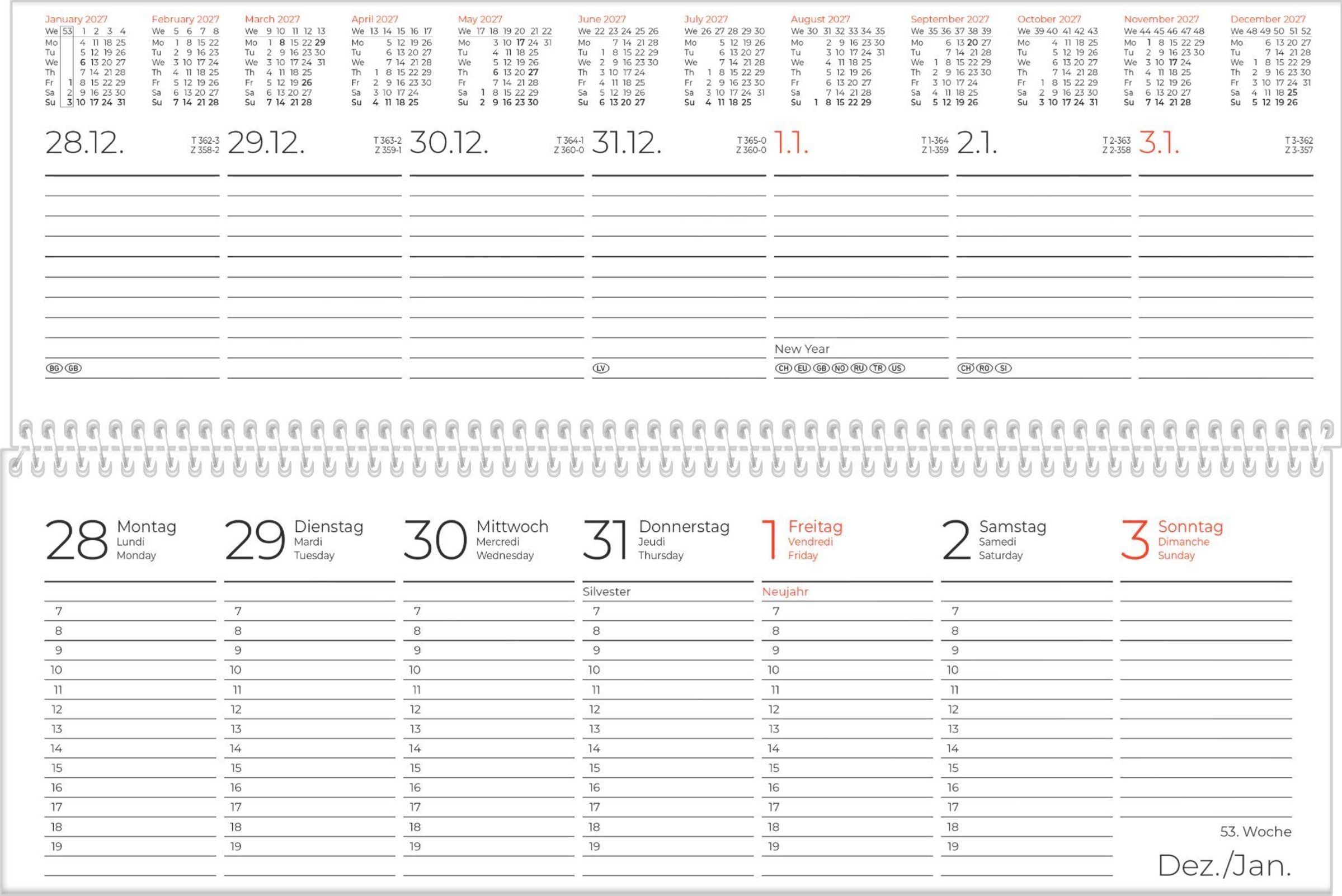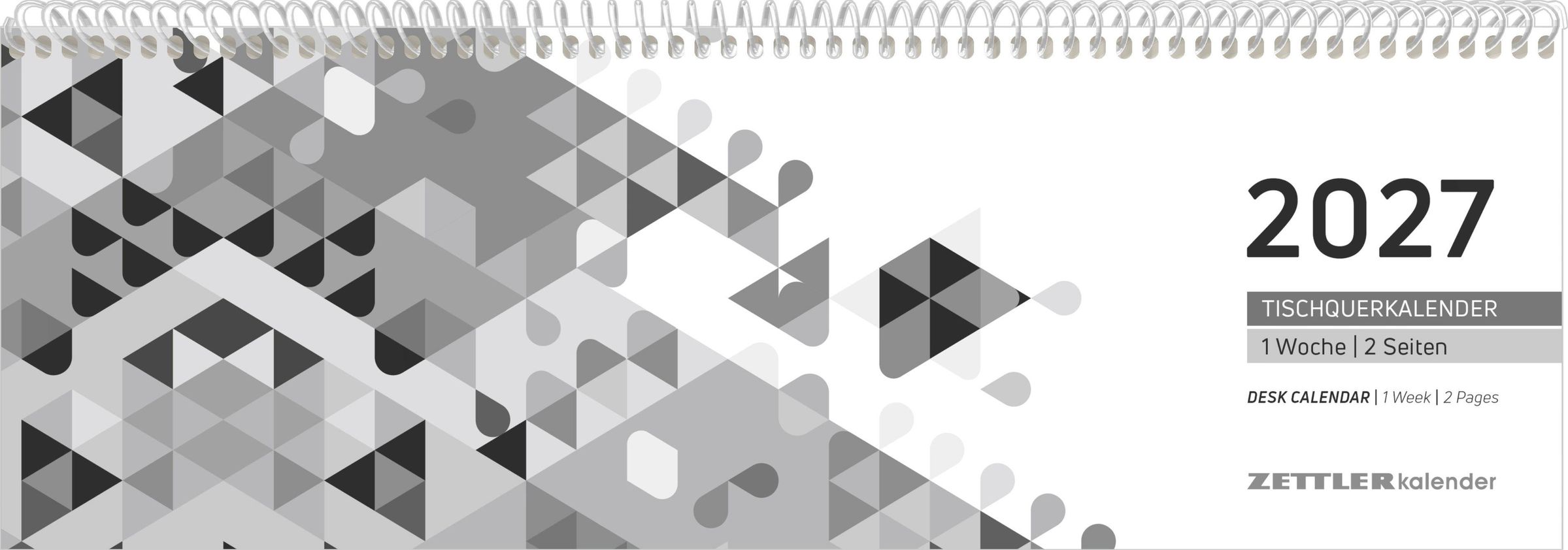 2027 Tischquerkalender, 1 Woche | 2 Seiten. Graue, geometrische Muster links, Spiralbindung oben., Kalender