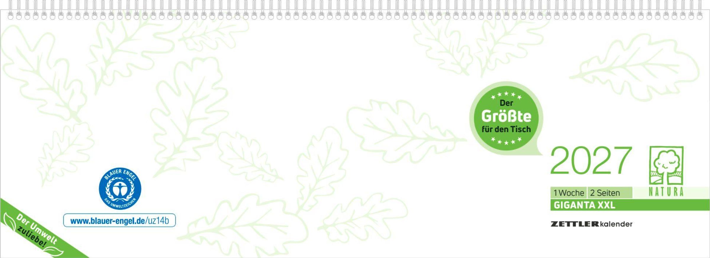 Der Zettler Tischquerkalender Giganta XXL Recycling 2027 vereint maximale Übersicht mit nachhaltiger Produktion. Komplett aus Recyclingpapier gefertigt und mit dem Blauen Engel ausgezeichnet, bietet er besonders viel Platz für Termine, Notizen und eine strukturierte Wochenplanung -- ideal für Büro und Homeoffice.