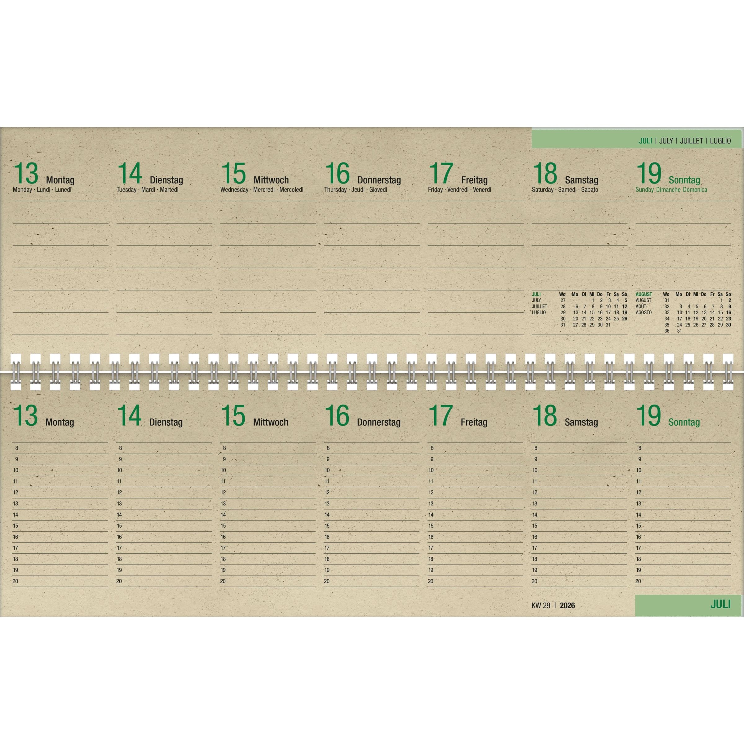 Tischquerkalender Graspapier 2026 - 32x10,5 cm - 1 Woche auf 2 Seiten - nachhaltiger Bürokalender - Stundeneinteilung 8 - 20 Uhr - 159-0640