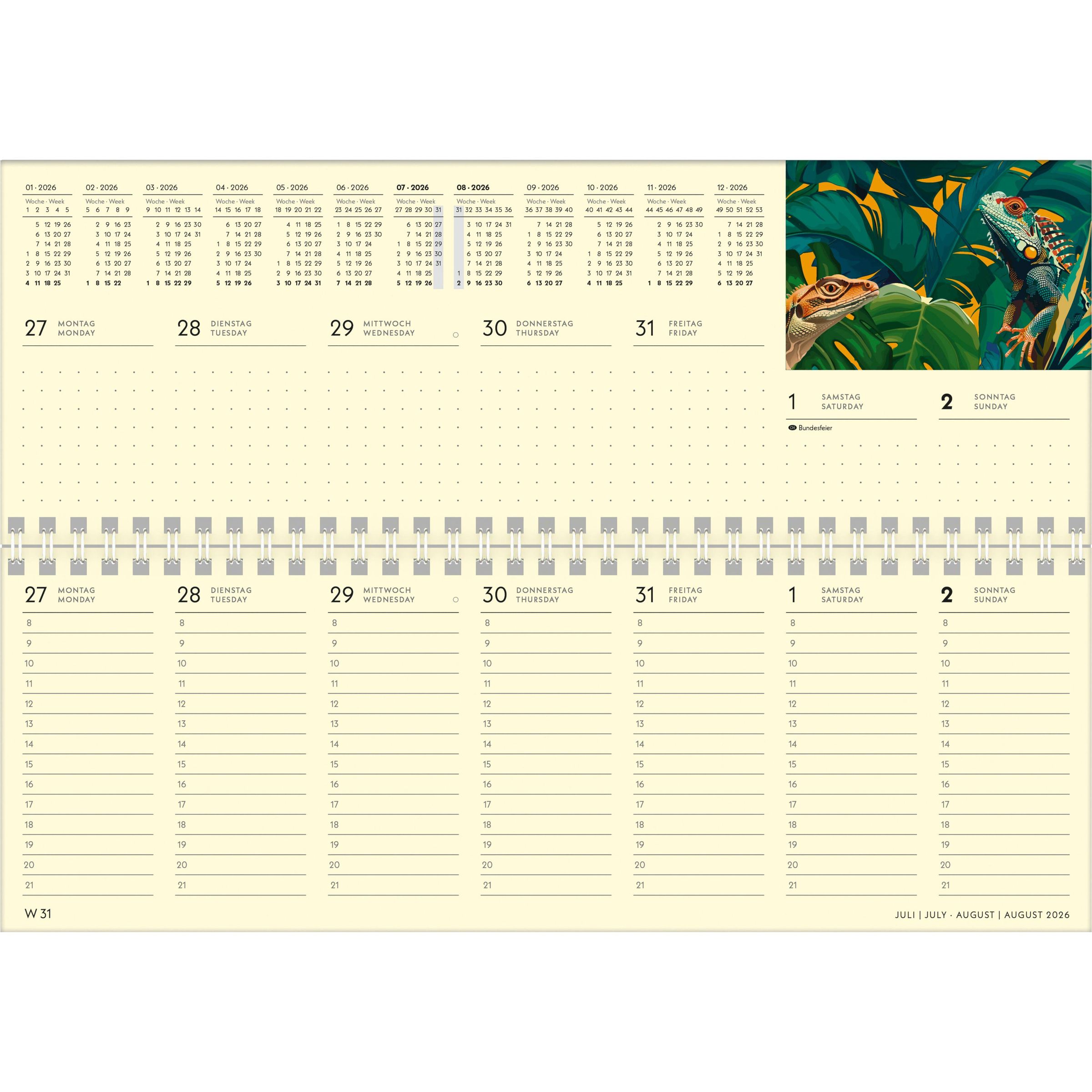 Mit dem Tischquerkalender Jungle 2026 behalten Sie nicht nur Ihre Termine bestens im Blick, sondern holen sich auch ein Stück Naturverbundenheit ins Büro.