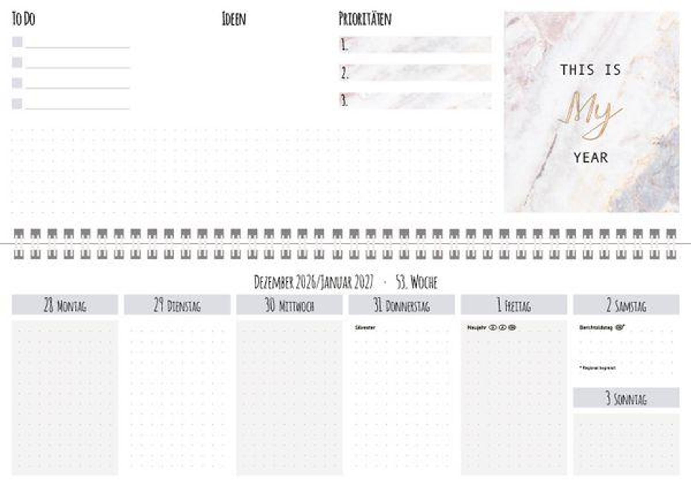 Jede Woche hält er auf 2 Seiten viel Platz für deine tägliche Terminplanung bereit: Listen für wöchentliche To-dos und Prioritäten sowie Raum für Notizen und spontane Ideen. Dabei kommt er überhaupt nicht kleinkariert daher, sondern im trendigen "dotted" Design und bietet somit individuelle Gestaltungsfreiheit bei deiner Planung. Vorschau für 2028.